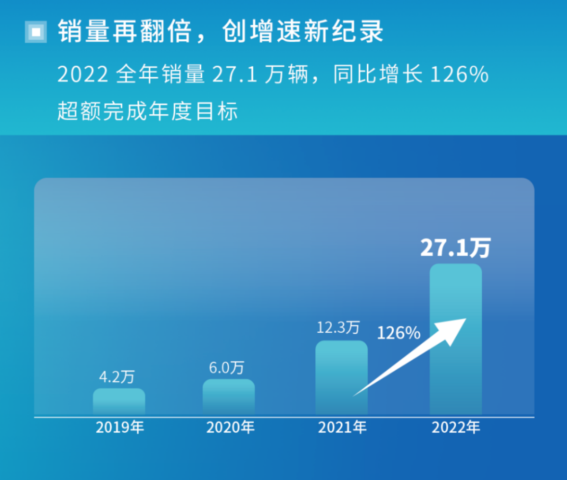 销量方面,埃安在2022年一共销售了27.1万辆纯电动汽车,并以126%的同比增长率刷新了历年销量增速纪录,稳居国内15万级以上主流电动汽车市场前三。