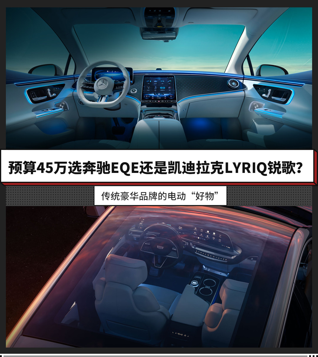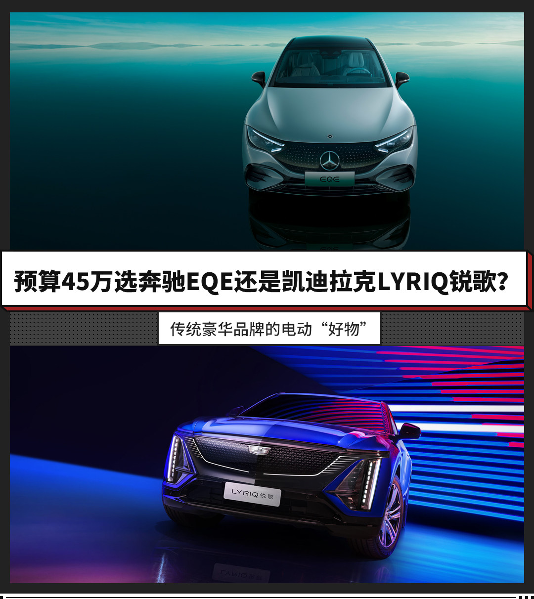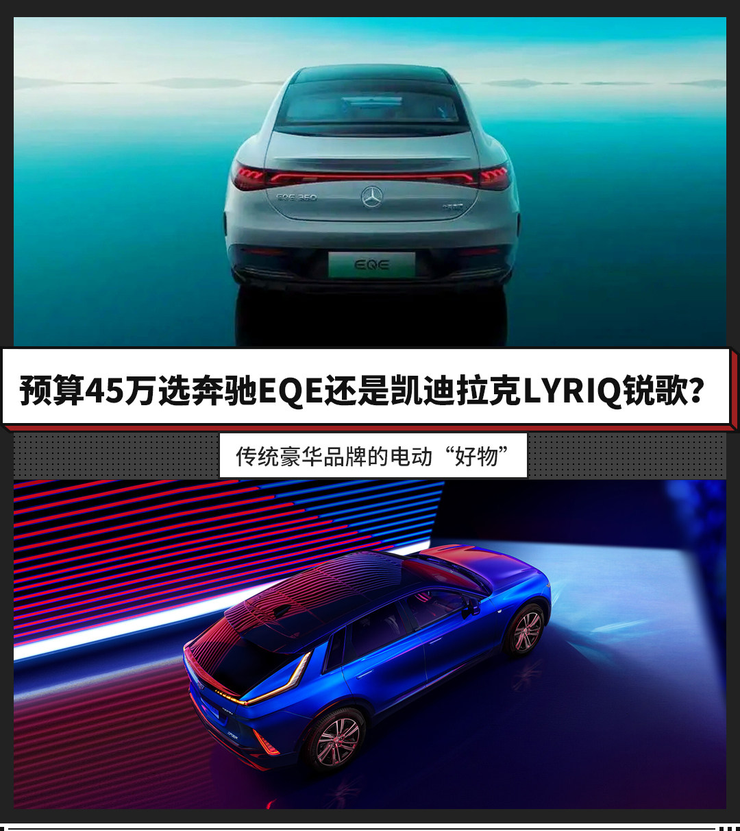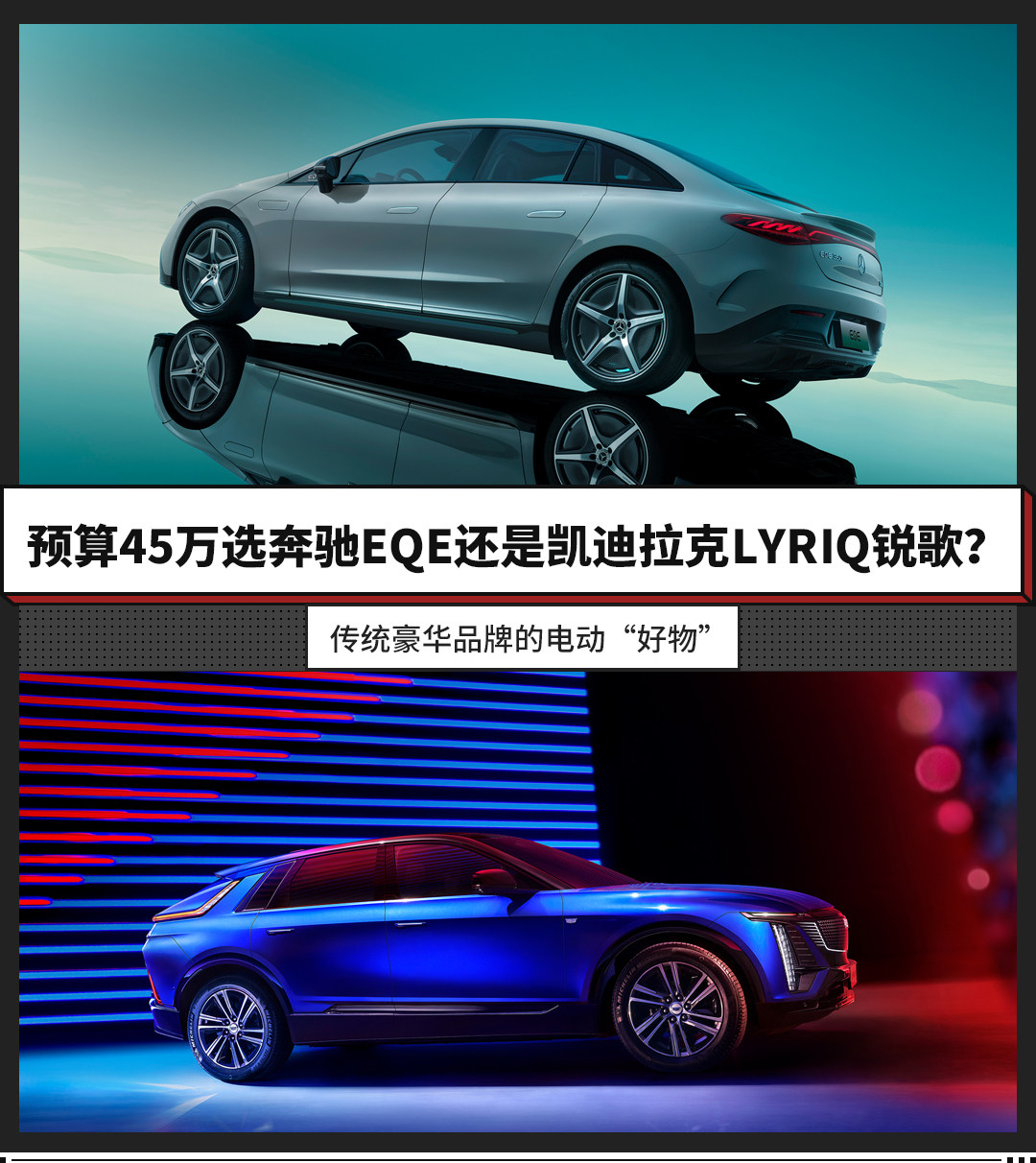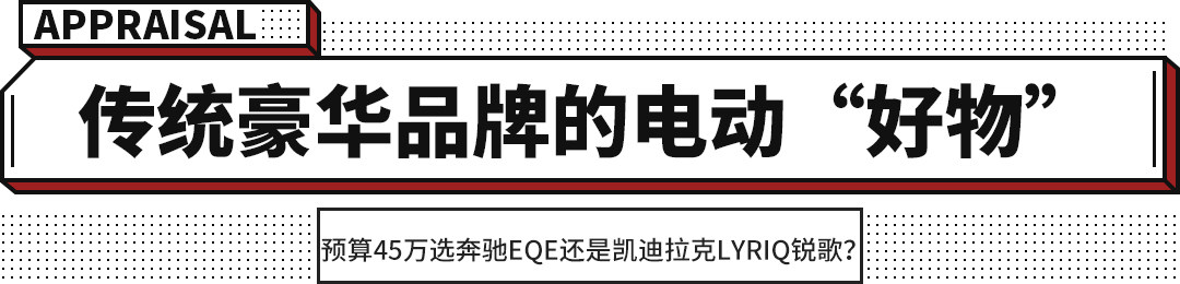 而我们今天的话题是,如果用户的购车预算在45万上下,更认可传统豪华品牌,不介意轿车和SUV的话,到底是选择奔驰EQE还是凯迪拉克LYRIQ锐歌呢?今天我们就以奔驰EQE 2022款 350 豪华版(指导价49.60万元,终端优惠5万+),以及凯迪拉克2022款 后驱长续航豪华版(指导价43.97万元,终端无优惠)为例,对这两款老牌豪华品牌的纯电车型进行一番对比。