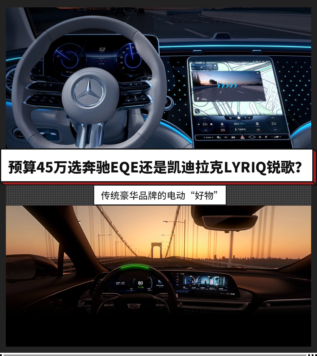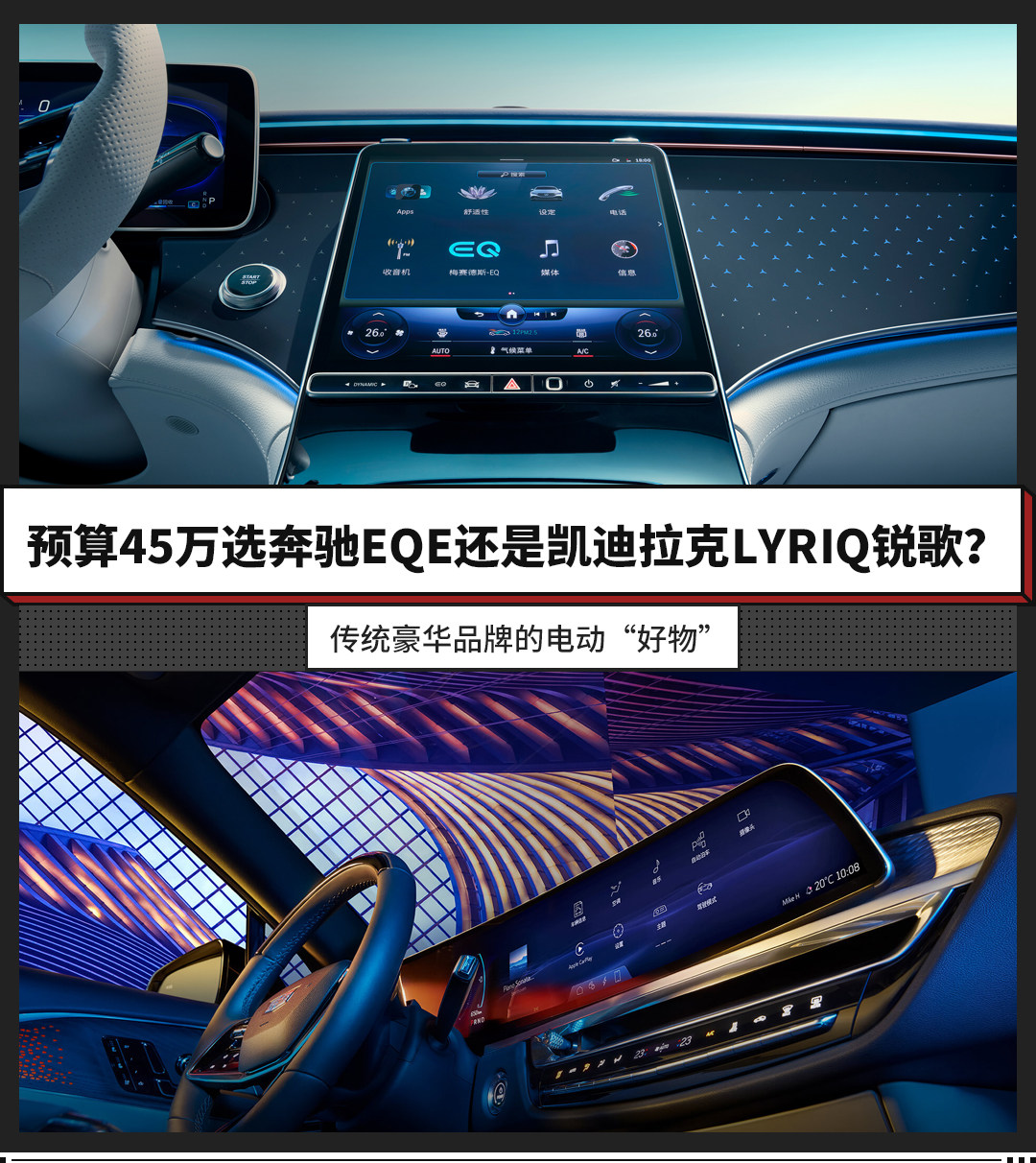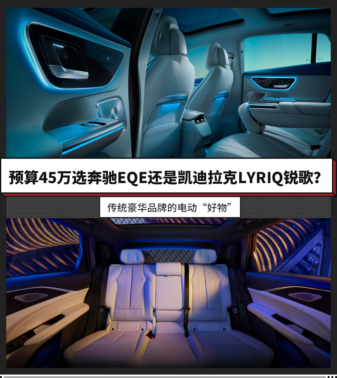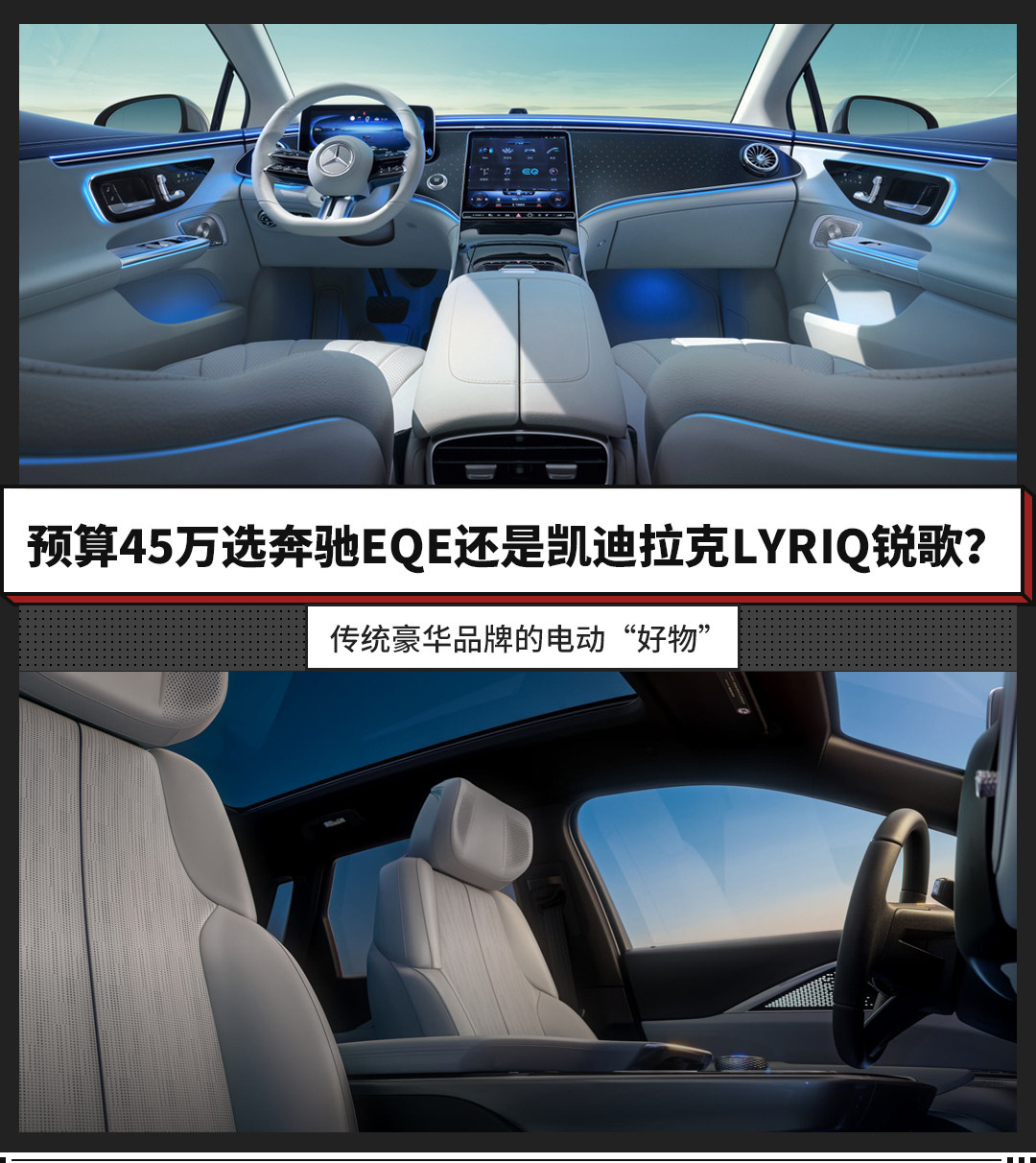 而我们今天的话题是,如果用户的购车预算在45万上下,更认可传统豪华品牌,不介意轿车和SUV的话,到底是选择奔驰EQE还是凯迪拉克LYRIQ锐歌呢?今天我们就以奔驰EQE 2022款 350 豪华版(指导价49.60万元,终端优惠5万+),以及凯迪拉克2022款 后驱长续航豪华版(指导价43.97万元,终端无优惠)为例,对这两款老牌豪华品牌的纯电车型进行一番对比。