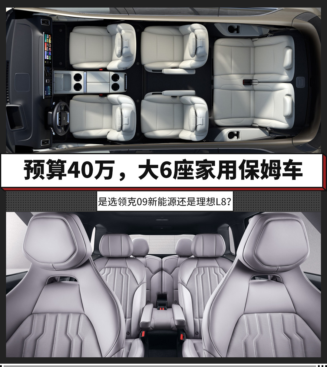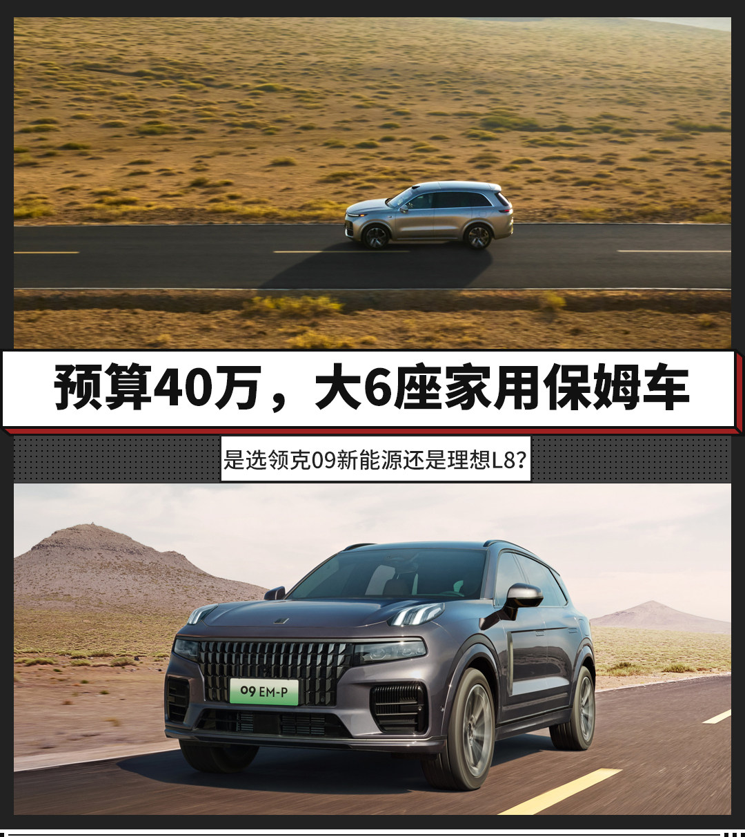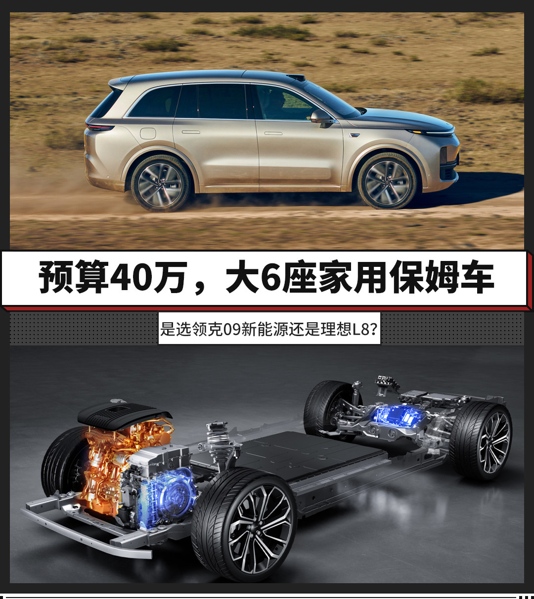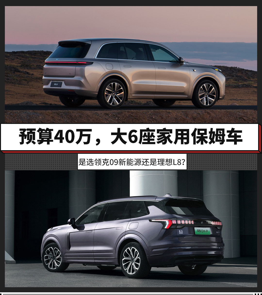 今天我们就以40万上下的预算,来看看当前那些炙手可热的家用保姆车,比如领克09新能源和理想L8,对于应付2大+2小+2老的全家出行都可以得心应手,而且插电混动或增程式混动,也不必担心续航里程的问题,还能上“绿牌”,出行不受限,家用很合适。那么,这两款车究竟谁更胜一筹呢?我们今天就以领克09新能源 2023款 2.0TD EM-P 远航版PM 六座(售价36.58万元)和理想L8 2023款Pro(六座,售价35.98万元)为例,来看看各自的产品力如何。