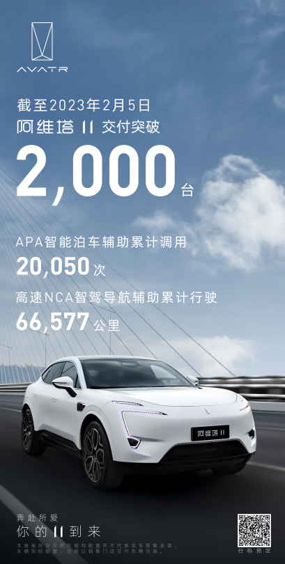 2023年2月6日(上海),阿维塔科技宣布,截至2023年2月5日,阿维塔首款情感智能电动轿跑SUV阿维塔11,在38天的时间内交付量超2000辆,刷新高端SEV品牌首款车型交付纪录。在此之前,阿维塔已经成为最快完成品牌发布到首款量产车下线的全新SEV品牌,成功跻身高端SEV第一梯队。