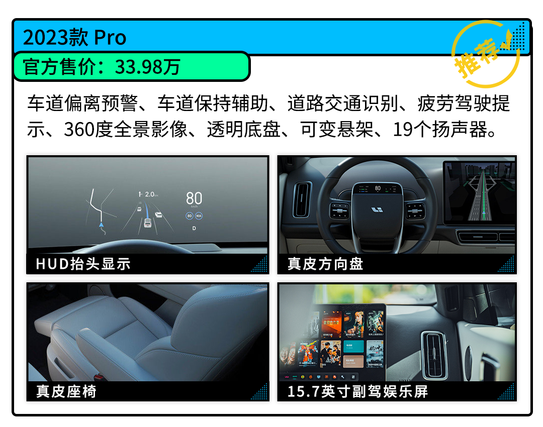 预算并不是相当吃紧并且注重性价比的话, Pro版确实是个不错的选择,它配有车道偏离预警、车道保持辅助、道路交通识别、疲劳驾驶提示、DOW开门预警、前后方碰撞预警功能、360度全景影像、透明底盘、可变悬架、19个扬声器以及256色氛围灯等,时下流行的安全配置和潮流配置均给你配上。相比入门版车型,Pro版车型更值得入手。