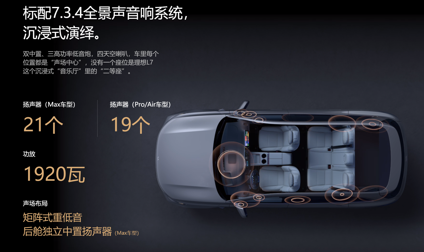 Pro版配备19个扬声器,Max版则有21个扬声器,音响配备铝膜高音单元、凯夫拉中音单元、碳纤维低音单元,结合杜比7.3.4全景声音响系统让您随时随地都能享受剧院体验。