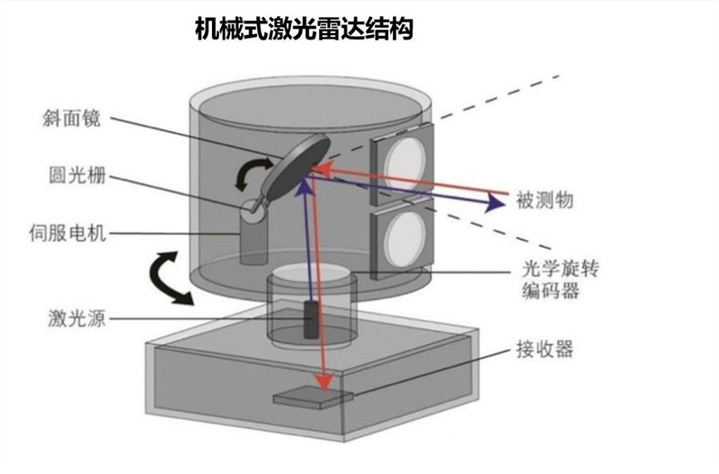 机械式激光雷达的主要优点在于便宜,功率也不需要太大。但它的缺点是非常明显的,由于它的成像原理不是同步成像,而是扫描式成像,这就意味着这种激光雷达虽然精度高,但获得有效图像信息的速度非常慢(毕竟速度取决于那个机构的旋转速度)。这也就是在激光雷达大规模商用的早期,包括特斯拉、小鹏等企业都表示不会用的原因,在那个时候,用摄像头拍摄,再用处理器处理信息得到路况信息的速度,比机械式激光雷达快上不少。