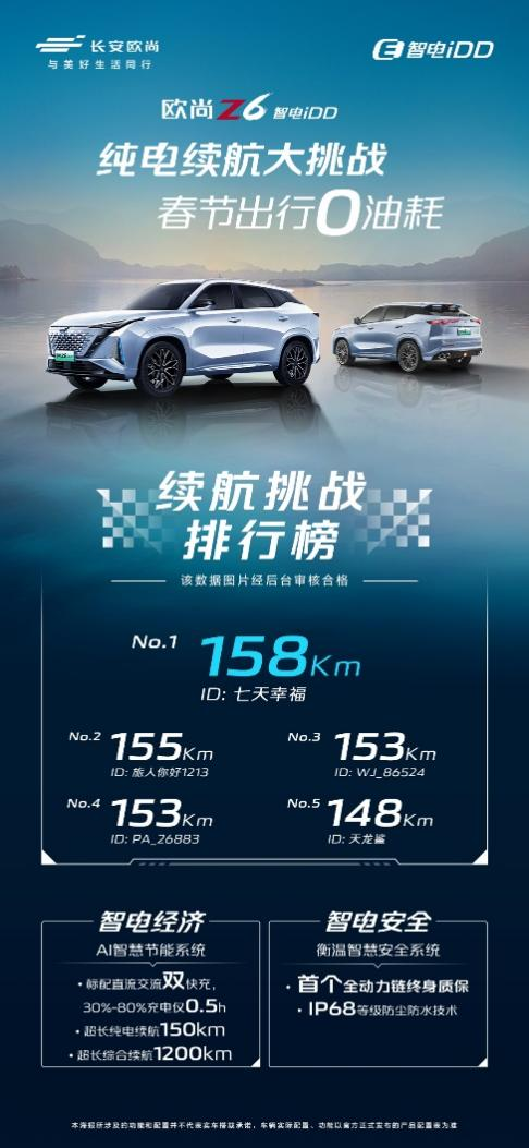 2月9日,欧尚Z6 智电iDD“纯电续航大挑战、新春出行0油耗”全网挑战赛成绩出炉。ID为“七天幸福”的欧尚Z6 智电iDD车主以158km的超长纯电续航成绩,荣获此次挑战赛冠军。在这场真实用车场景共测中,用户亲身感受欧尚Z6 智电iDD 150km超长纯电续航的硬核实力,真正实现了市区通勤0燃油。