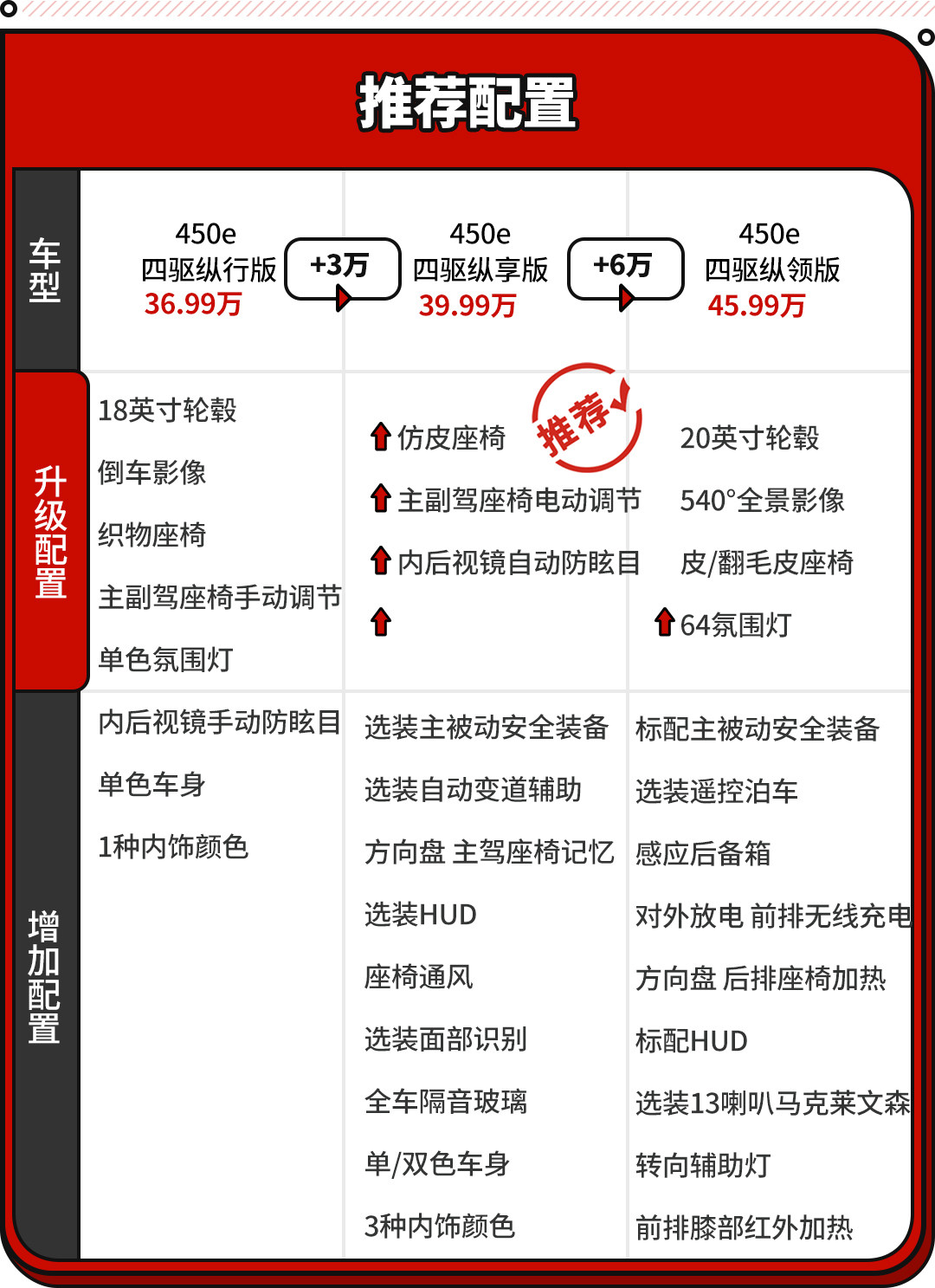 虽然顶配的配置丰富,但价格也贵了6万元,且续航短了不少,一些配置可以在中配上选装获得。
