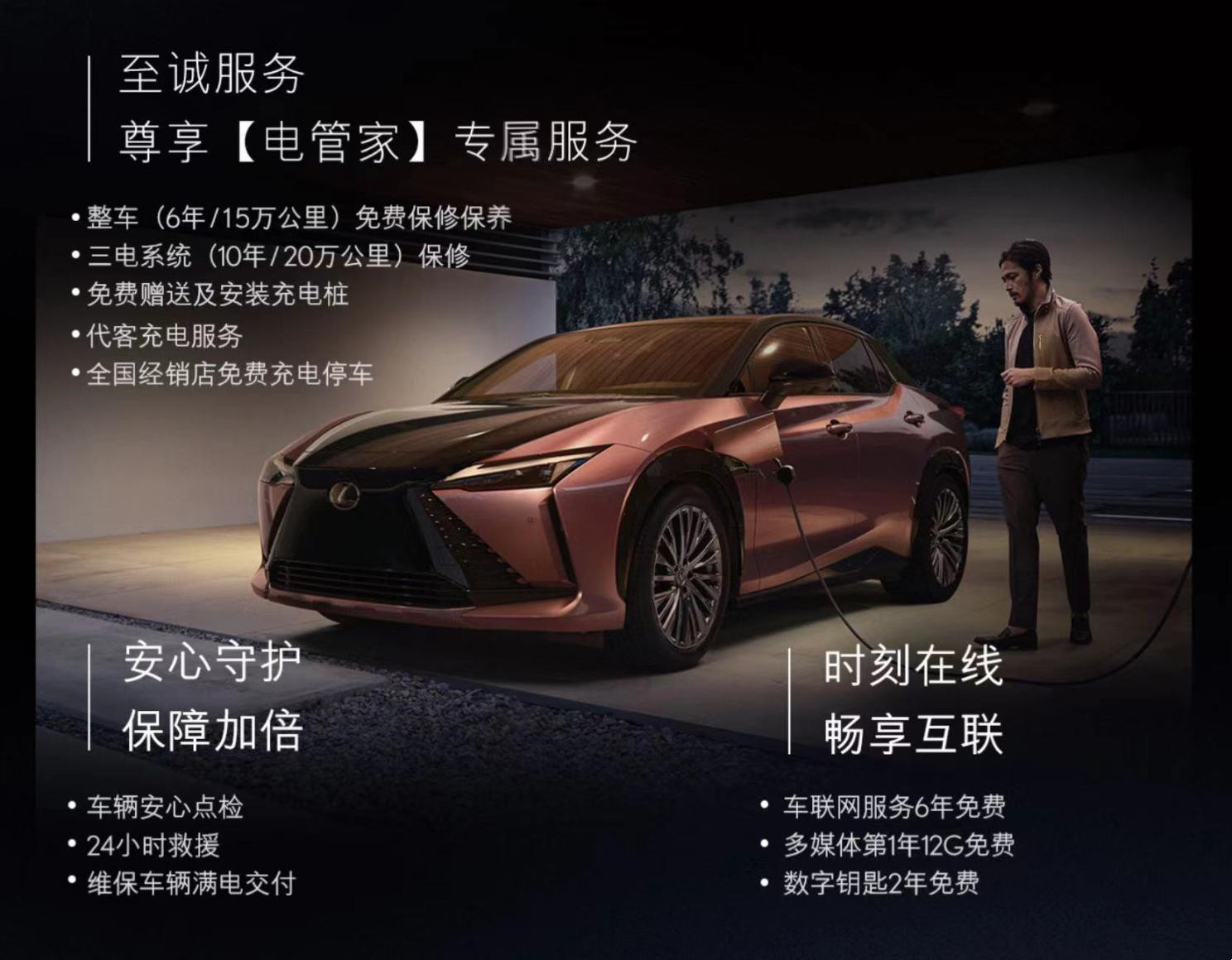新车用户在置换雷克萨斯车型时,最高可享一年内90%、两年内80%、三年内70%、四年内60%的保值权益。还提供6年或15万公里整车免费保修、免费保养、三电系统10年或20万公里免费保修等服务。