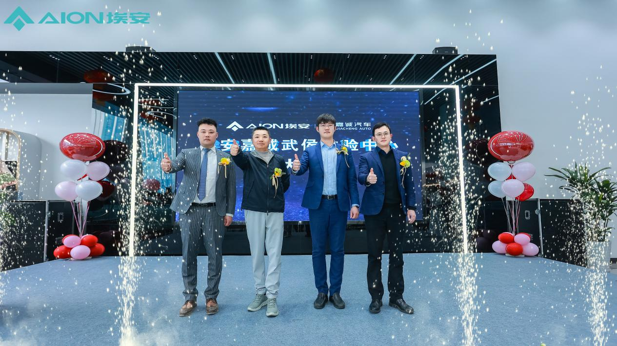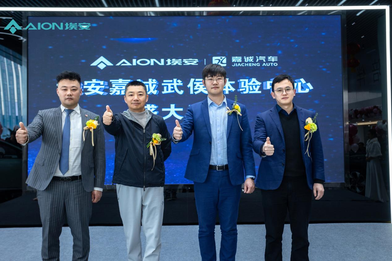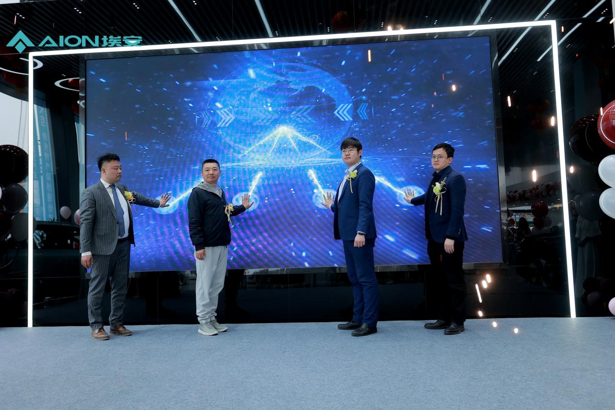 嘉诚汽车集团总裁郑中伦先生、广汽埃安西区大区主任范磊磊先生、广汽埃安川渝战区经理郭磊先生、广汽埃安嘉诚成都武侯体验中心总经理胡凡先生手触大屏与现场嘉宾一起见证广汽埃安成都嘉诚武侯体验中心开业时刻。