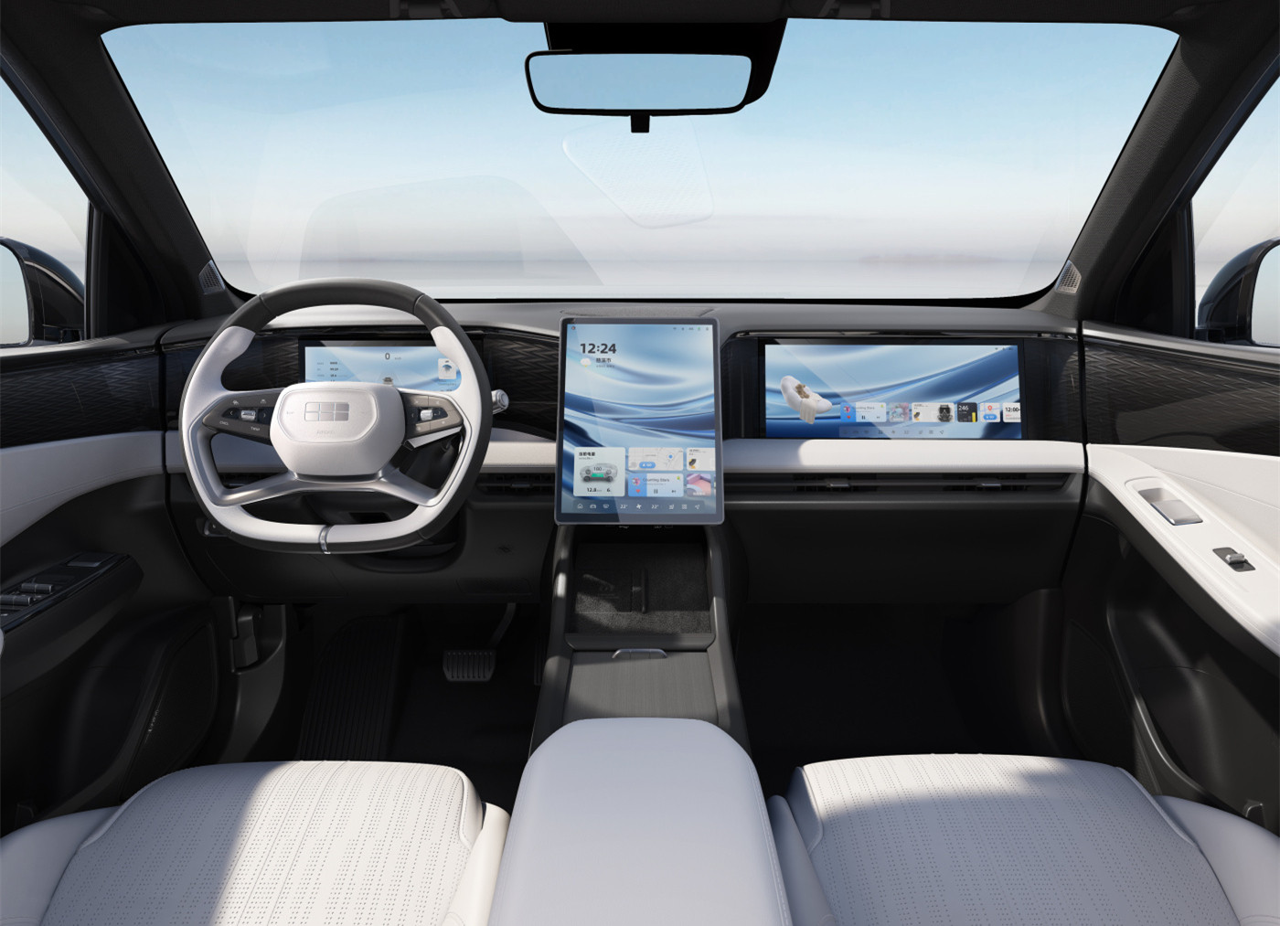 AR-HUD的显示效果相当于25.6英寸,方向盘采用了不显运动的四辐样式,空调出风口放在了较低的位置,车门的开关整合在了门板的扶手上。