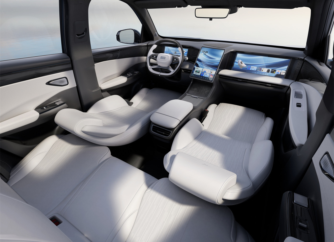 由于屏幕占用了位置,所以副驾配备了同级唯一的顶置安全气囊。副驾座椅提供了腿托,以及加热、通风、按摩、理疗等功能,影院模式下,座椅会自动后移放并倒至35°。