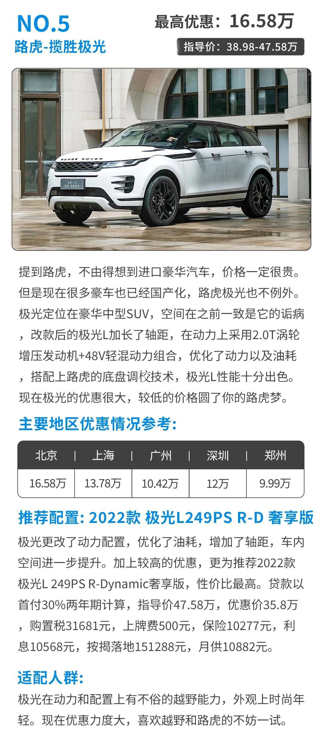 奔驰GLC、宝马X3、奥迪Q5L,林肯航海家、路虎揽胜极光这几款车型一直都是在中型SUV中热销的主力车型,品牌加持、高颜值、动力、空间、配置、豪华感也不差。刚开始甚至要加价才能提车,而且40万左右价格区间更容易被更多消费者接受,所以销量一路高歌,现在部分车接近换代,价格上有优惠,在竞争上更加激烈。