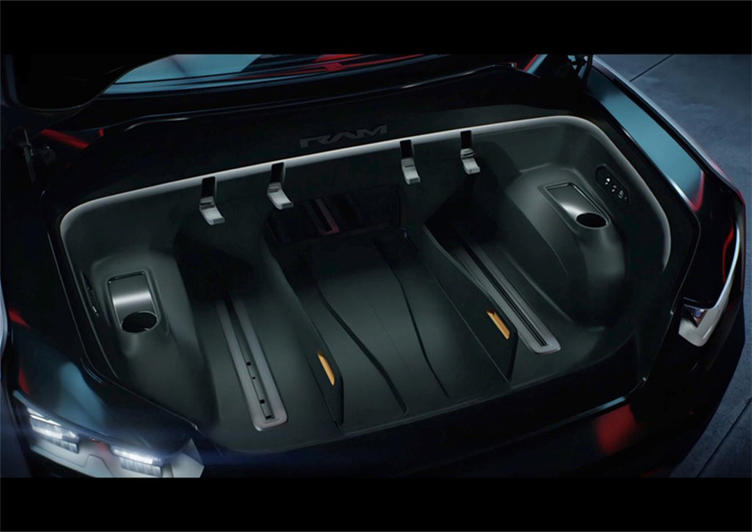 前脸取消了经典的RAM家族大尺寸格栅,更改为电动车惯用的封闭式设计。两侧个性化的LED灯组中间,隐藏着可以发光的RAM品牌标识。但依旧拥有厚重的前包围,保留了美式皮卡的肌肉感。