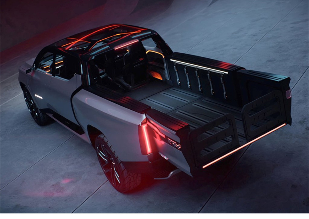 车头还有一个巨大的储物空间,与福特F-150 Lightning相同。车顶的全景天窗具有电变颜色功能,可以调节透明度。