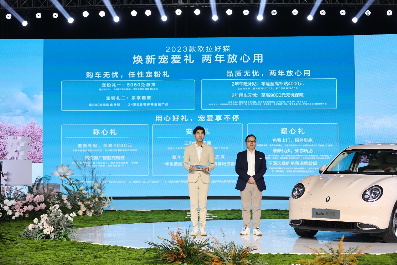 在发布会上,2023款欧拉好猫宣布宠爱升级,发布了“焕新宠爱礼,两年放心用”的限时福利政策。即日起至3月31日,凡下订2023款欧拉好猫的用户,即可享受包含宠粉礼、无忧礼、称心礼、安心礼、暖心礼在内的五重礼包。