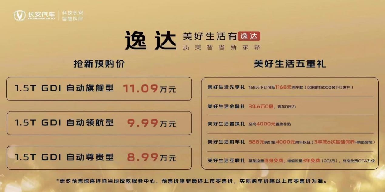 2月20日预售开启后,凡下订逸达的用户,除享受超值预售价格,还可获168元下订抵1168元购车款的美好生活先享礼;3年6万0息的美好生活金融礼;至高4000元置换补贴的美好生活置换礼;588元购价值4000元用车权益(3年或6次基础保养+精品套装)的美好生活用车礼;以及基础流量终身免费、增值流量3年免费(2G/月)、终身免费OTA升级的美好生活互联礼等。众多美好生活大礼,助力用户轻松开启高品质美好汽车生活!