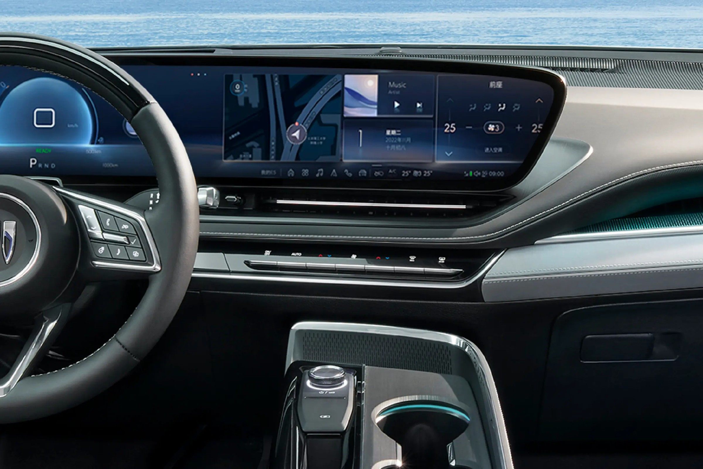 此前新车内饰未曝光时,教授就预计其也将采取搭载大尺寸屏幕的简洁风格,此次公布出的图片也印证了之前的猜测。别克Electra E5将搭载全新一代VCS智能座舱,配备了一块尺寸为30英寸的触控式曲面连体屏,屏幕分辨率为6008×934,相信这块分辨率高达6K且30英寸大的屏幕会带来十分出色的使用体验。