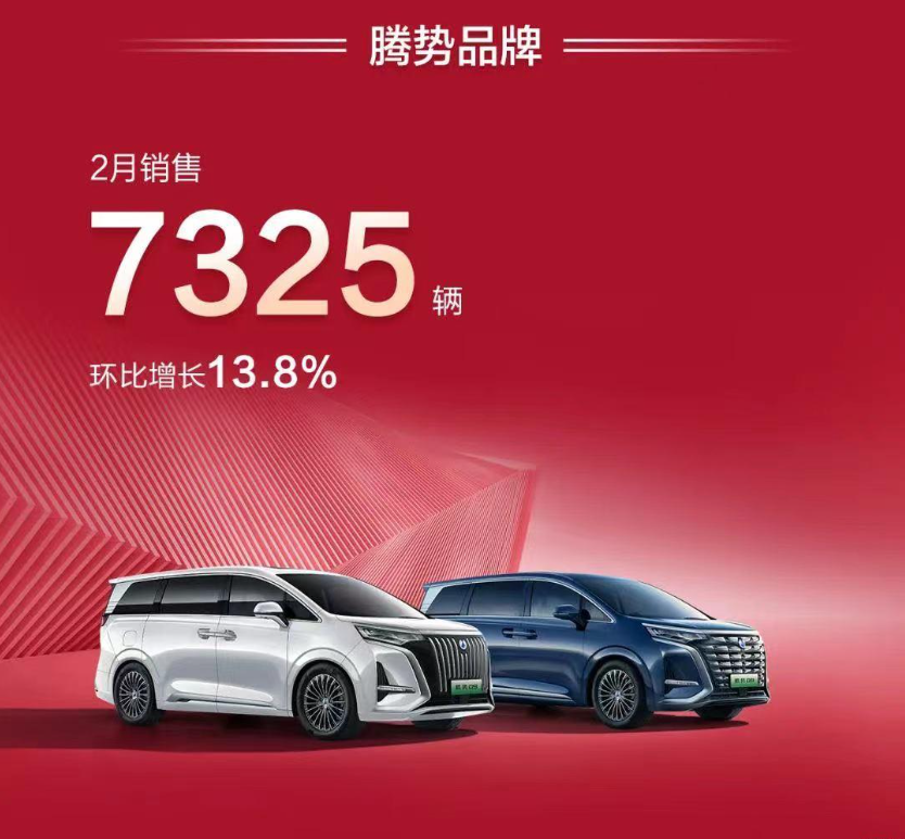 D9的首批车在去年10月底交付后,短短的3个月时间里,就让腾势在品牌换新的第一年就实现了过万辆的销量,同比增长73.9%。而今年2月的销量也达到了7325辆,环比增长13.8%。