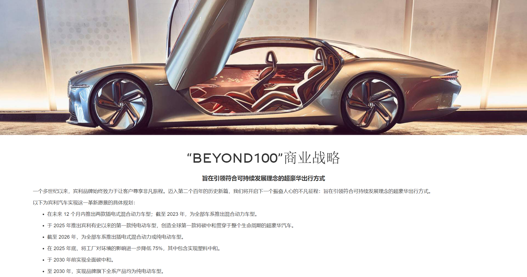 对于Beyond100战略,宾利是这样描述的:“一个多世纪以来,宾利品牌始终致力于让客户尊享非凡旅程。迈入第二个百年的历史新篇,我们将开启下一个振奋人心的不凡征程:旨在引领符合可持续发展理念的超豪华出行方式。”