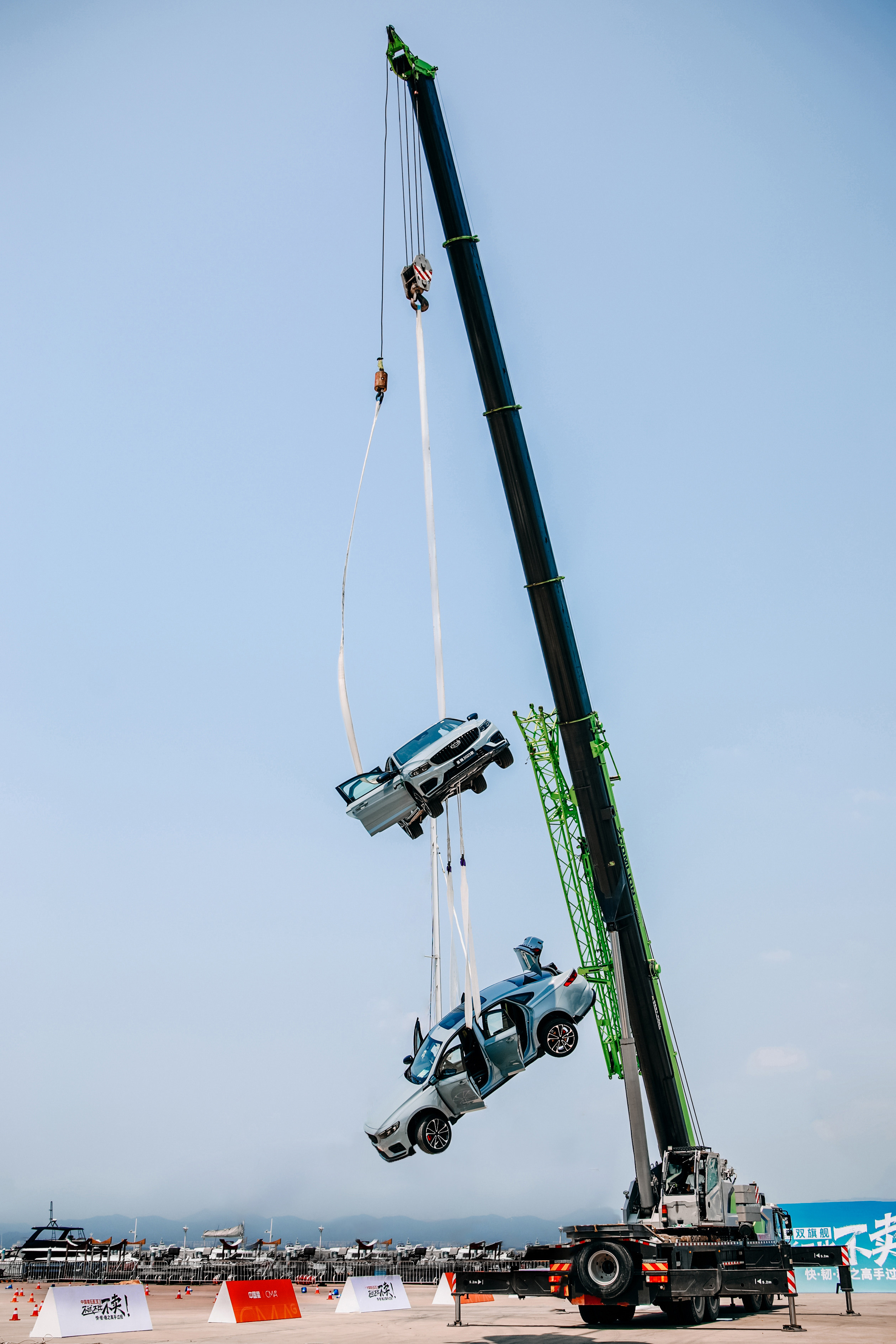 在“稳”招——高手过招之钢铁威亚挑战中,首先测量了静止状态下星瑞车门3个点位的间隙数据,分别是3.4mm,3.5mm,3.4mm。挑战时,星瑞一侧B柱与吊车相连,并通过前后车悬架悬挂另一台星瑞,与吊车相连端B柱承重3T,最后悬吊车辆进行摆动测试。挑战后再次测量星瑞3个点位的数据是3.4mm,3.6mm,3.5mm,经过对比,悬吊前后只有0.1mm的微小变化,挑战后的数据依然小于竞品德系标杆S,完胜竞品车型,挑战成功。