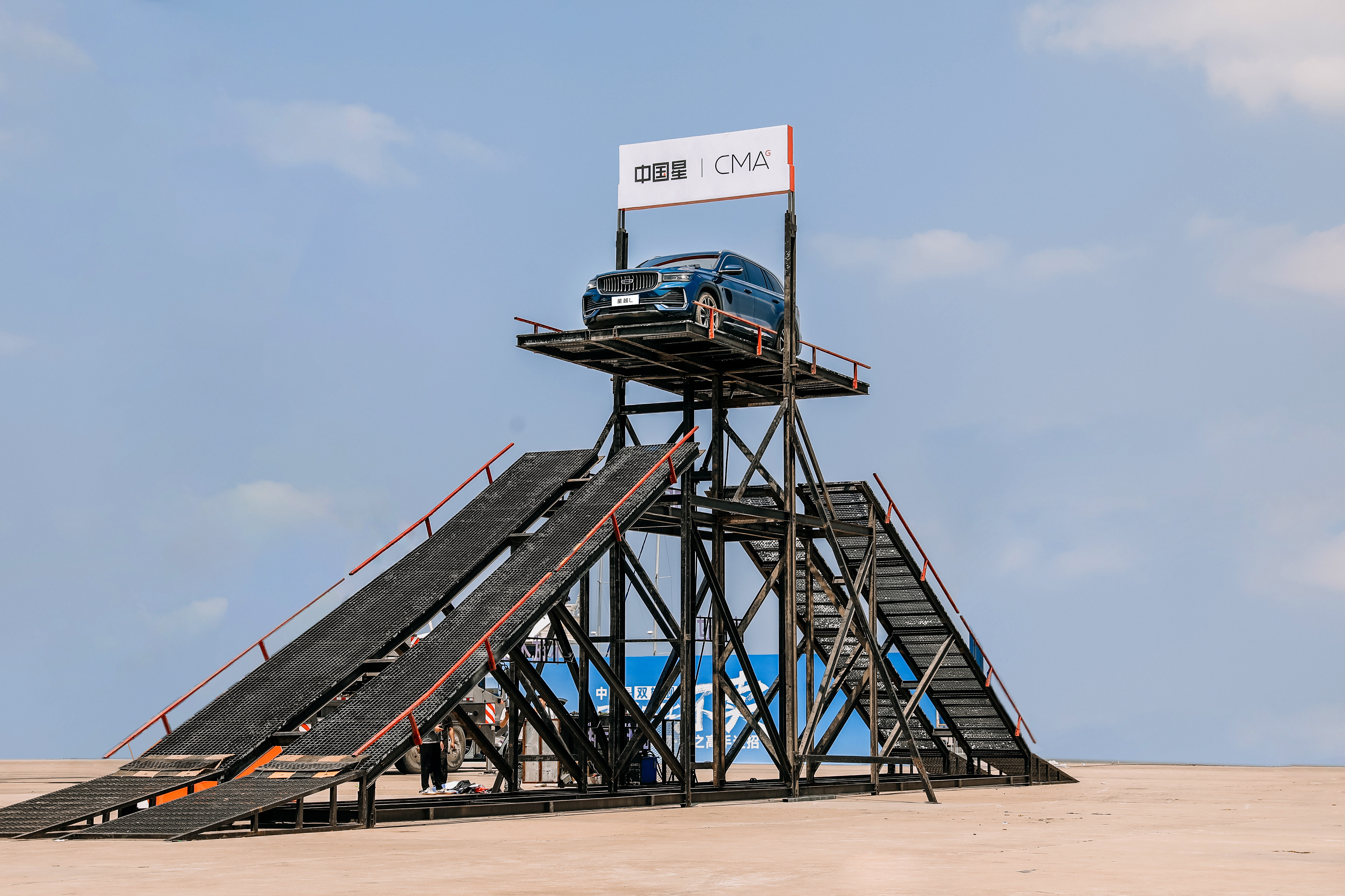 在“韧”招——高手过招之高空跷板挑战中,星越L爬上37°高坡,到达10米高的坡顶后,精准停止在跷板中心位置,随后从跷板另一端平稳驶下,整个过程一气呵成,展现出优异的四驱爬坡能力、精准动力控制与制动性。