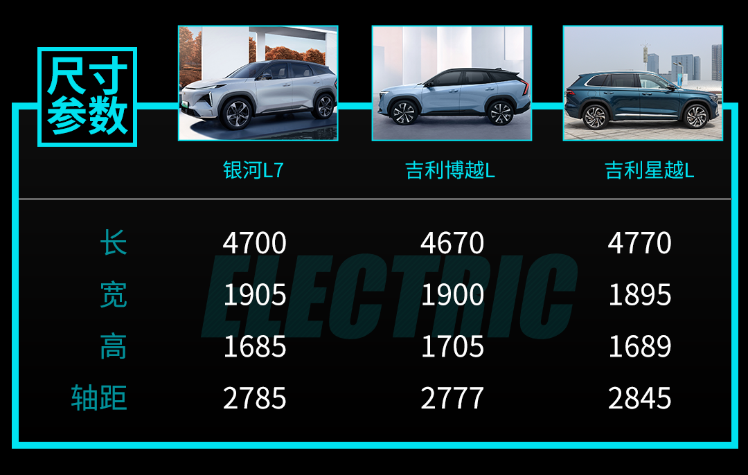 车身尺寸方面,根据申报信息显示,银河L7的长宽高分别为4700/1905/1685mm,轴距为2785mm,定位为紧凑型SUV。并没有采取像造车新势力或传统自主高端品牌那般直接整出个中大型SUV,给人看起来会更加亲民的同时,又显得不够高端。