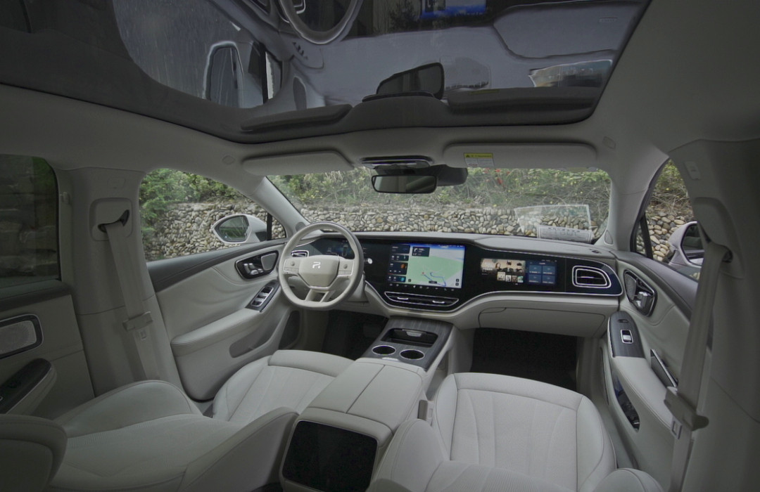 内饰质感也是相当到位,跟蔚来有的一拼,三联屏设计在飞凡R7上已经见识过了,屏幕够大,用起来够顺滑、清晰,只是个人有点不太习惯的是,由于屏幕是有一定的倾斜角度,所以当我想看仪表盘的时候,总会情不自禁地挺直身板。解决这个问题的办法只有把坐姿调高,不过这样就不太战斗咯......