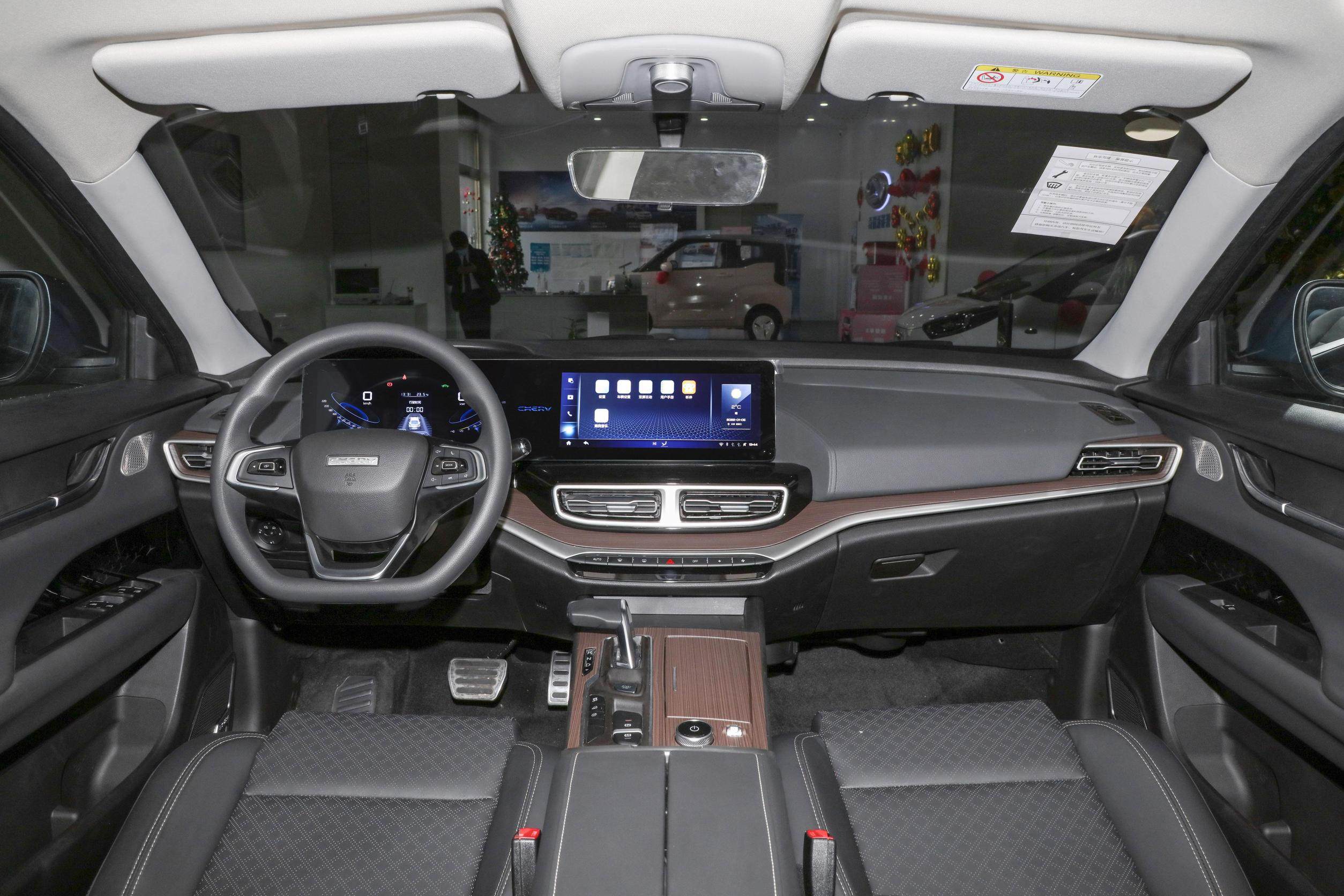 当然,从另一张图也能看到,新车还是有做出了一些改变的,内饰没采用奇瑞大蚂蚁的木纹装饰,而是更多采用皮质包裹;多功能方向盘的按键换成了触控和滚轮设计。