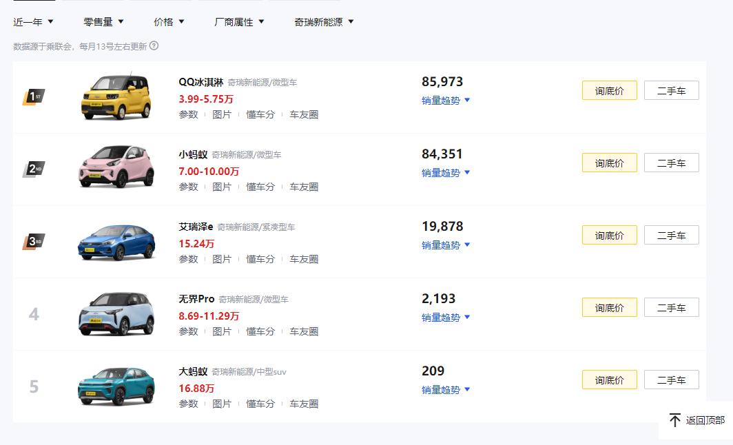 强调“突然”是因为在2022年,奇瑞新能源的销量和车型布局是不太如意的,从图片就能看到,主销车型只有QQ冰淇淋和小蚂蚁,且主要售价区间在10万以内,价格再往上的车型表现就开始不温不火了。