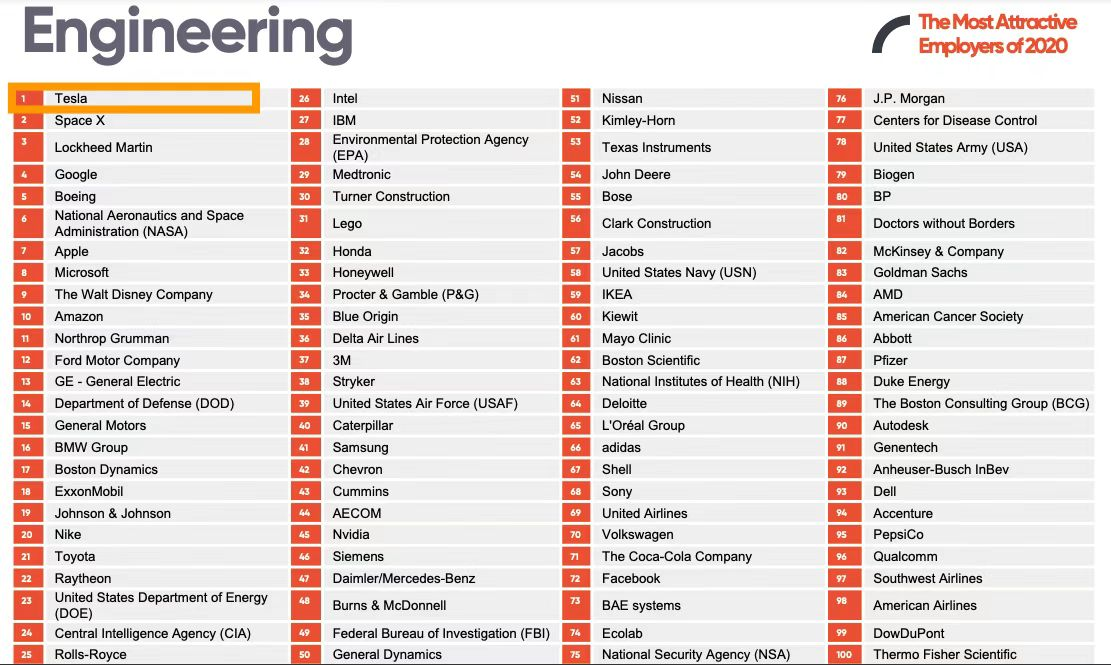 据了解,在咨询机构Universum对北美工程专业学生的调研统计中,特斯拉成为“对美国工程专业学生最有吸引力的汽车公司”,并且在2020年工科学生最想去的公司榜单中排名第一。