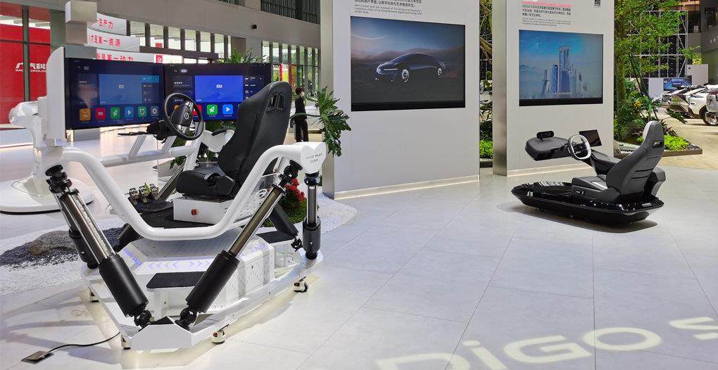 觉得不够过瘾?别急,广汽科技馆甚至还专门为孩子们(当然,得是年纪不太小的孩子)搞了2个体验装置。一个是广汽智能驾驶相关的体验仪,这个东西其实是一个4轴全动式3D座椅外加一套体验软件的组合。很多赛车队给车手做模拟器练习时,用的就是这种4轴式全动座椅,这玩意很昂贵,一套造价超过10万。当然了,体验感也很好,至少我一个30多岁的“老男孩”在上面都玩得不想下来,这玩意对男孩,是有致命吸引力的。