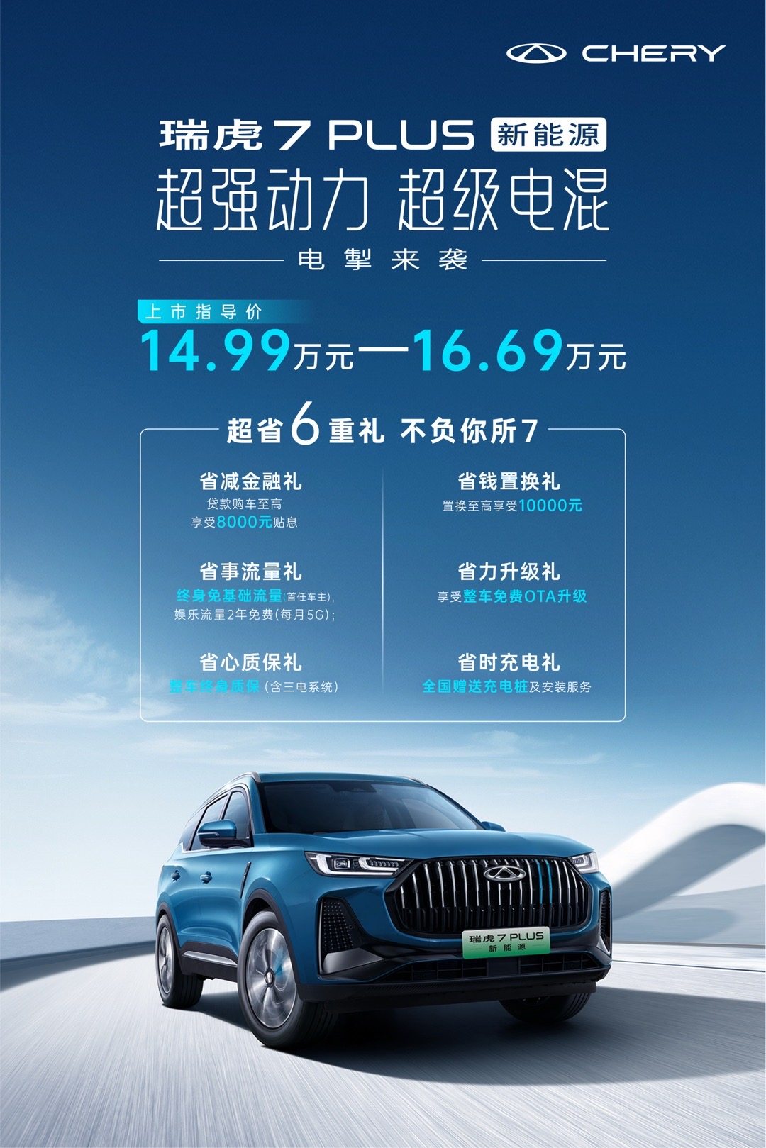与用户最好的关系,是双向奔赴。为了让用户买得舒心和省心,瑞虎7 PLUS 新能源特别带来了极具诚意的超省6重礼:①省减金融礼:贷款购车至高享受8000元贴息;②省钱置换礼:置换至高享受10000元;③省事流量礼:终身免基础流量(首任车主),娱乐流量2年免费(每月5G); ④省力升级礼:享受整车免费OTA升级;⑤省心质保礼:整车终身质保(含三电系统)⑥省时充电礼:全国赠送充电桩及安装服务。显然,瑞虎7 PLUS 新能源切实做到了“懂用户所想、宠用户所需”,为用户带来买车无忧、用车无忧、养车无忧的全新价值体验。