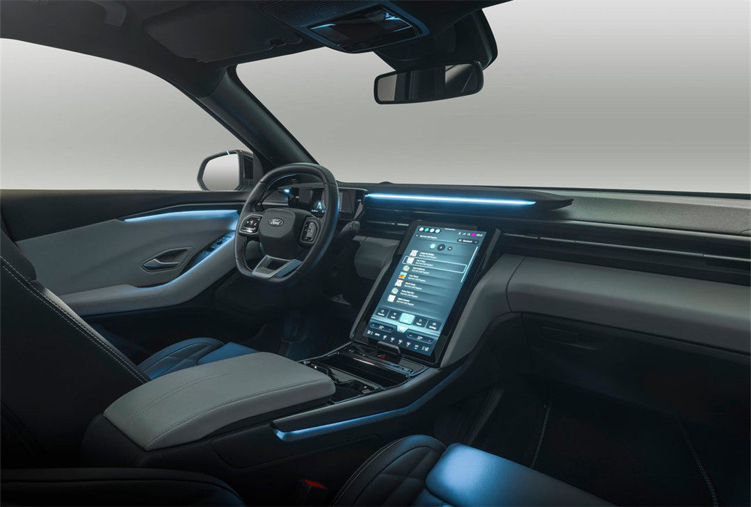 把目光转至于内饰部分,不难看出Explorer EV延续了福特家族一贯的传统,“T”字型中控运用大量线条进行勾勒,层次感瞬间就被营造出来。