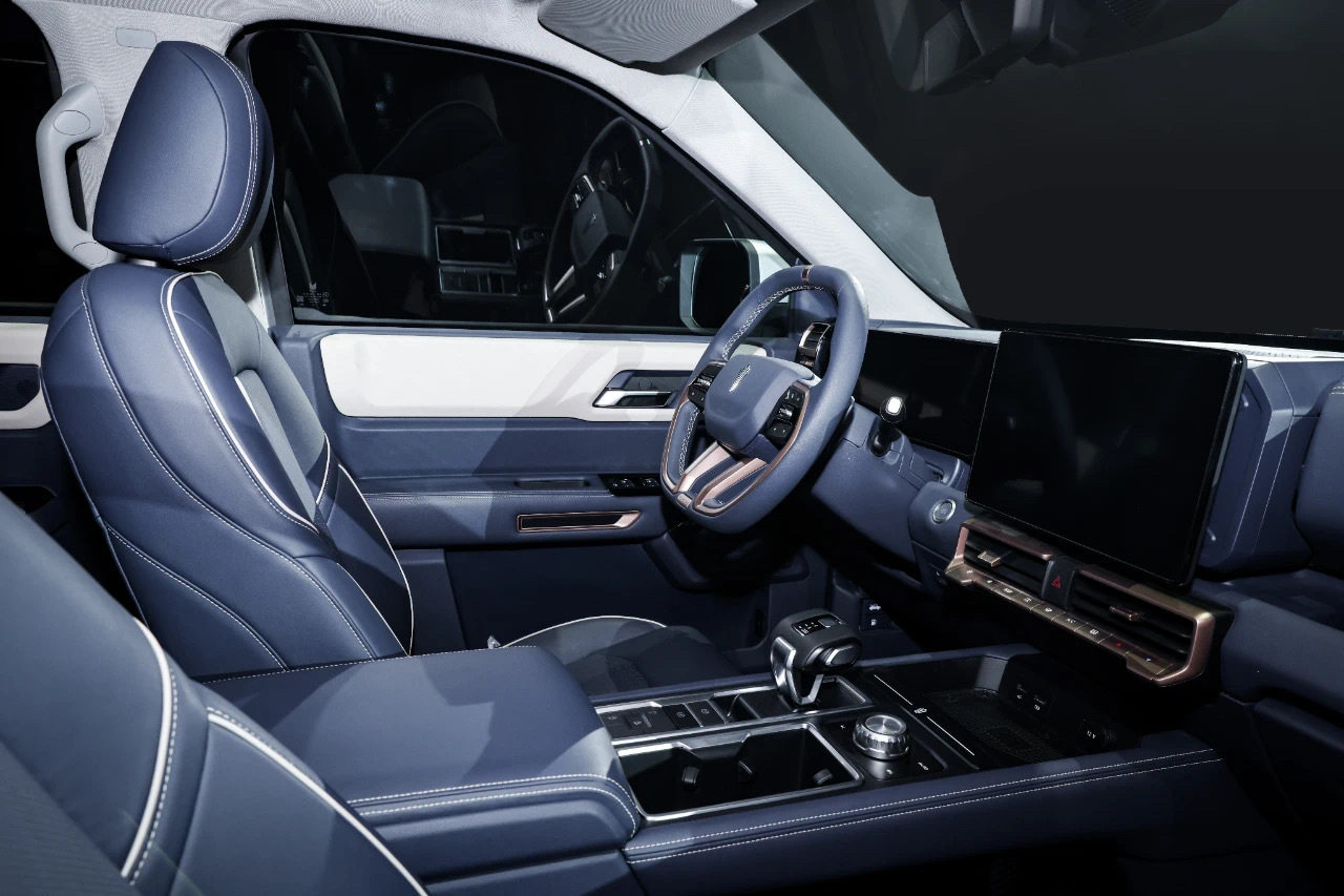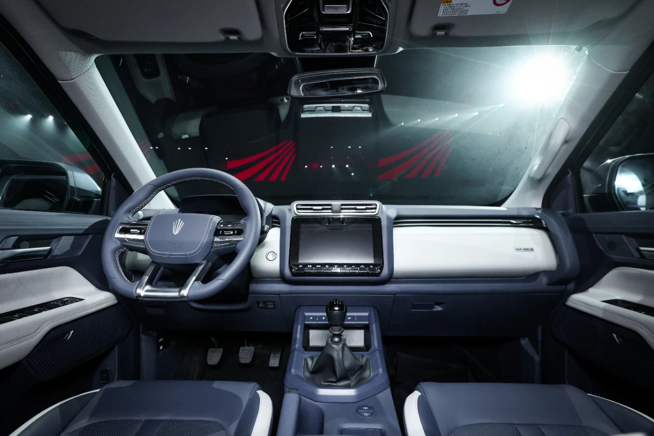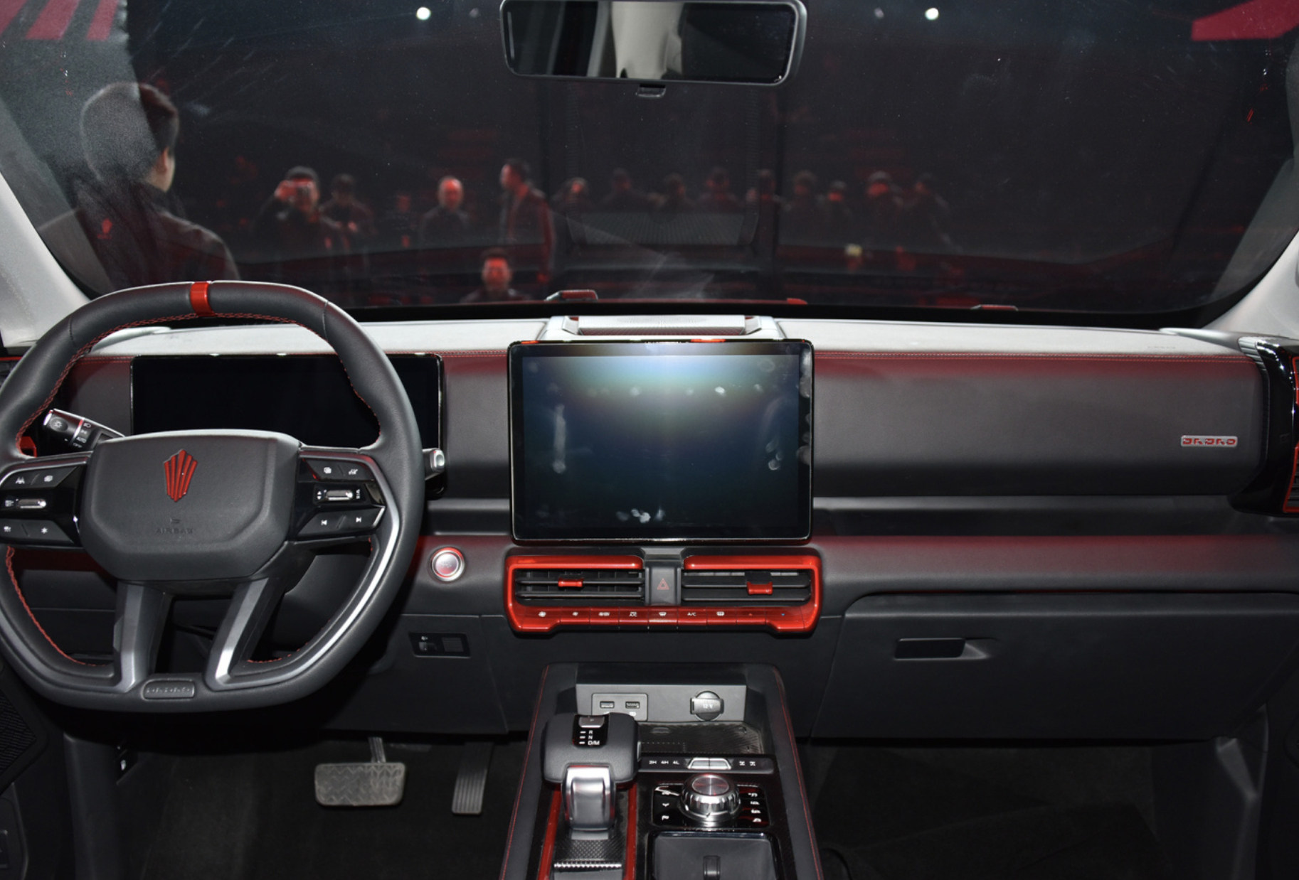 越野版则采用乘用版车型相近的内饰布局,均配有悬浮式液晶仪表盘和中控屏幕,但采用了与车身同色的配色方案,细节部分的内饰用料带有翻毛皮材质,有点小热血。