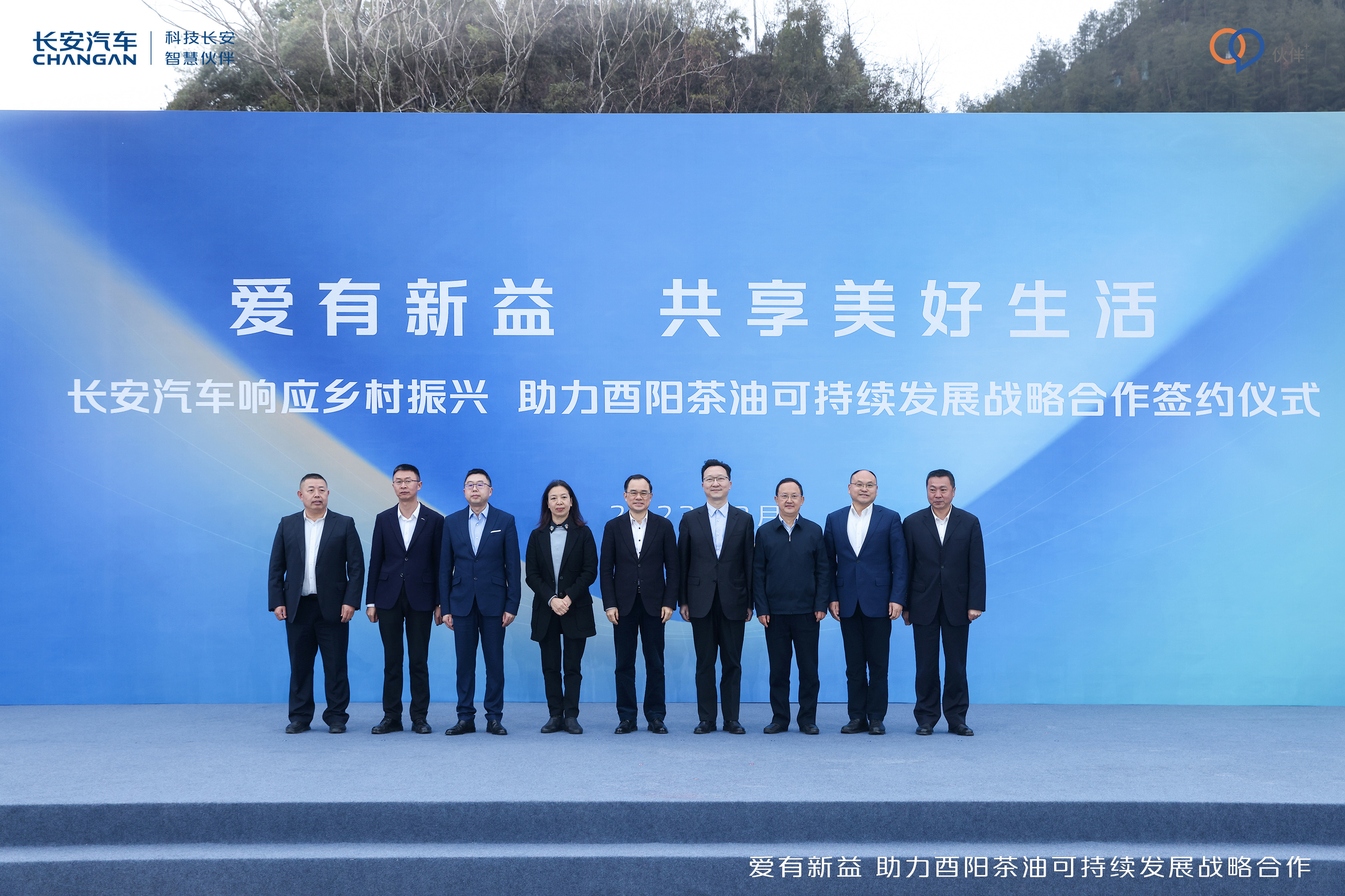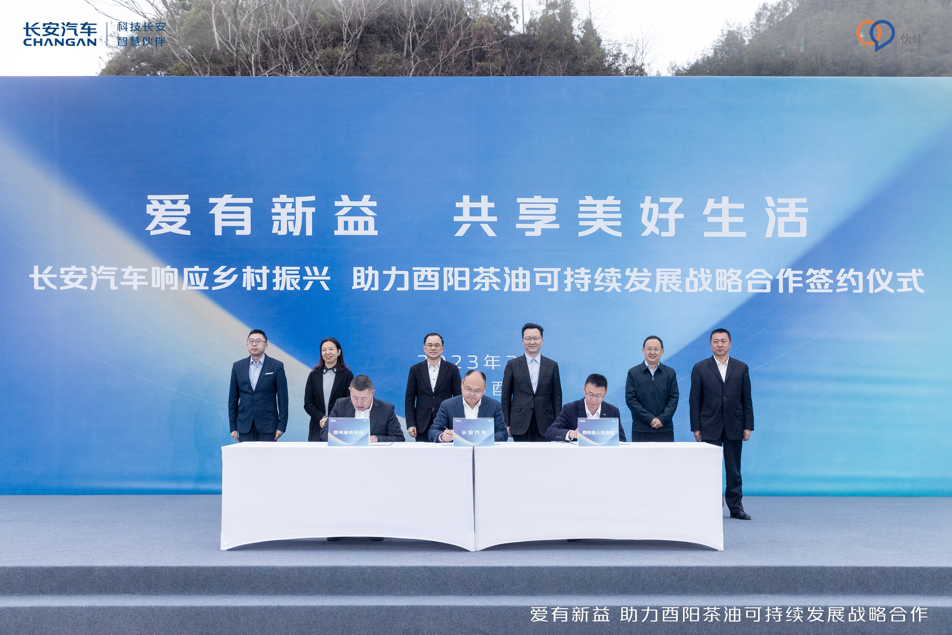 一片油茶树,铺就振兴路。2023年3月28日,重庆市酉阳县桃花源举行了以“爱有新益,共享美好生活”为主题的长安汽车响应乡村振兴助力酉阳茶油可持续发展战略合作签约仪式。在江北区委区政府、重庆乡村振兴局、酉阳县委县政府、长安汽车领导及各界嘉宾的共同见证下,长安汽车、酉阳县人民政府、酉州油茶科技有限公司现场签署了《可持续发展帮扶协议》。