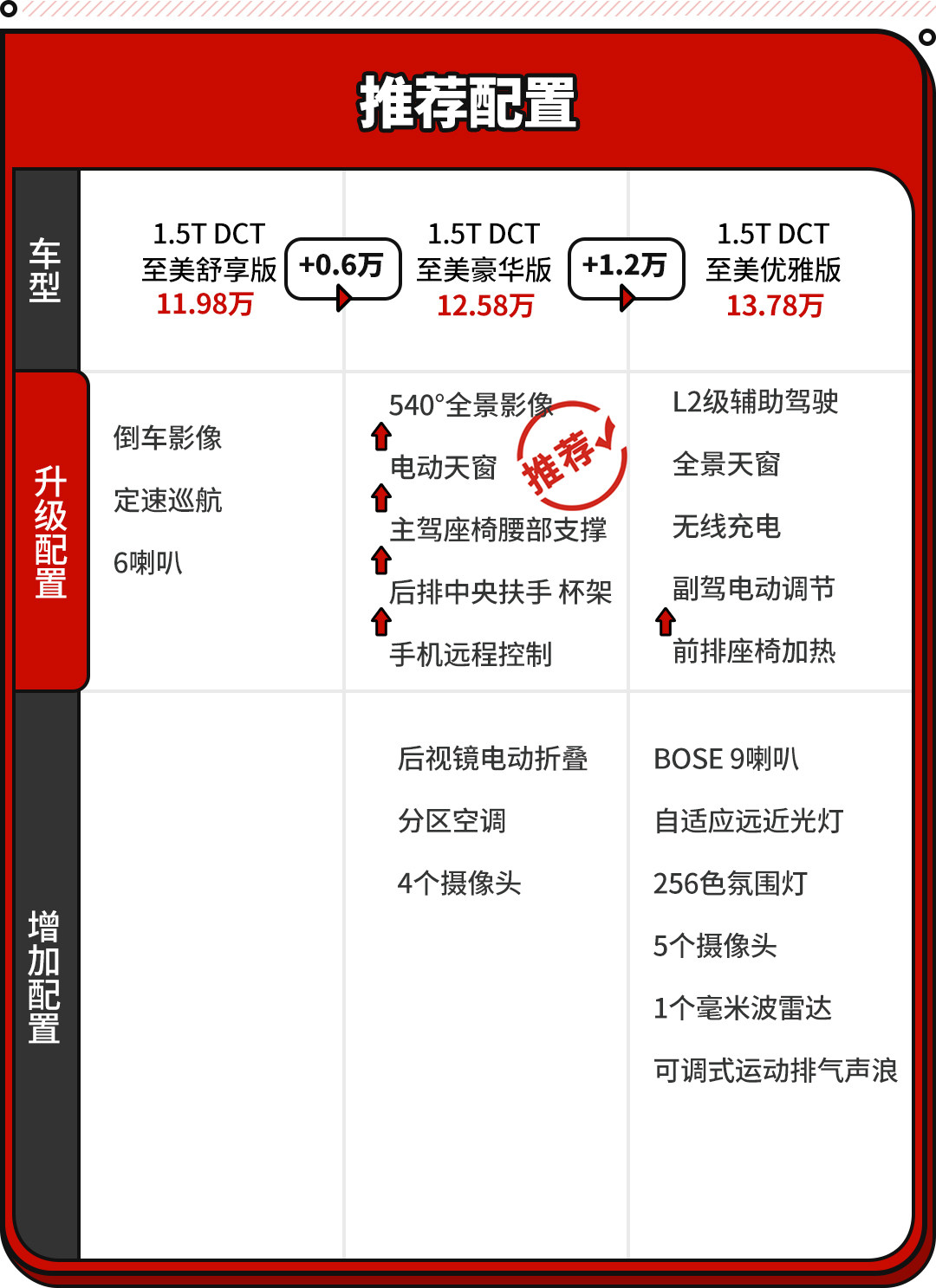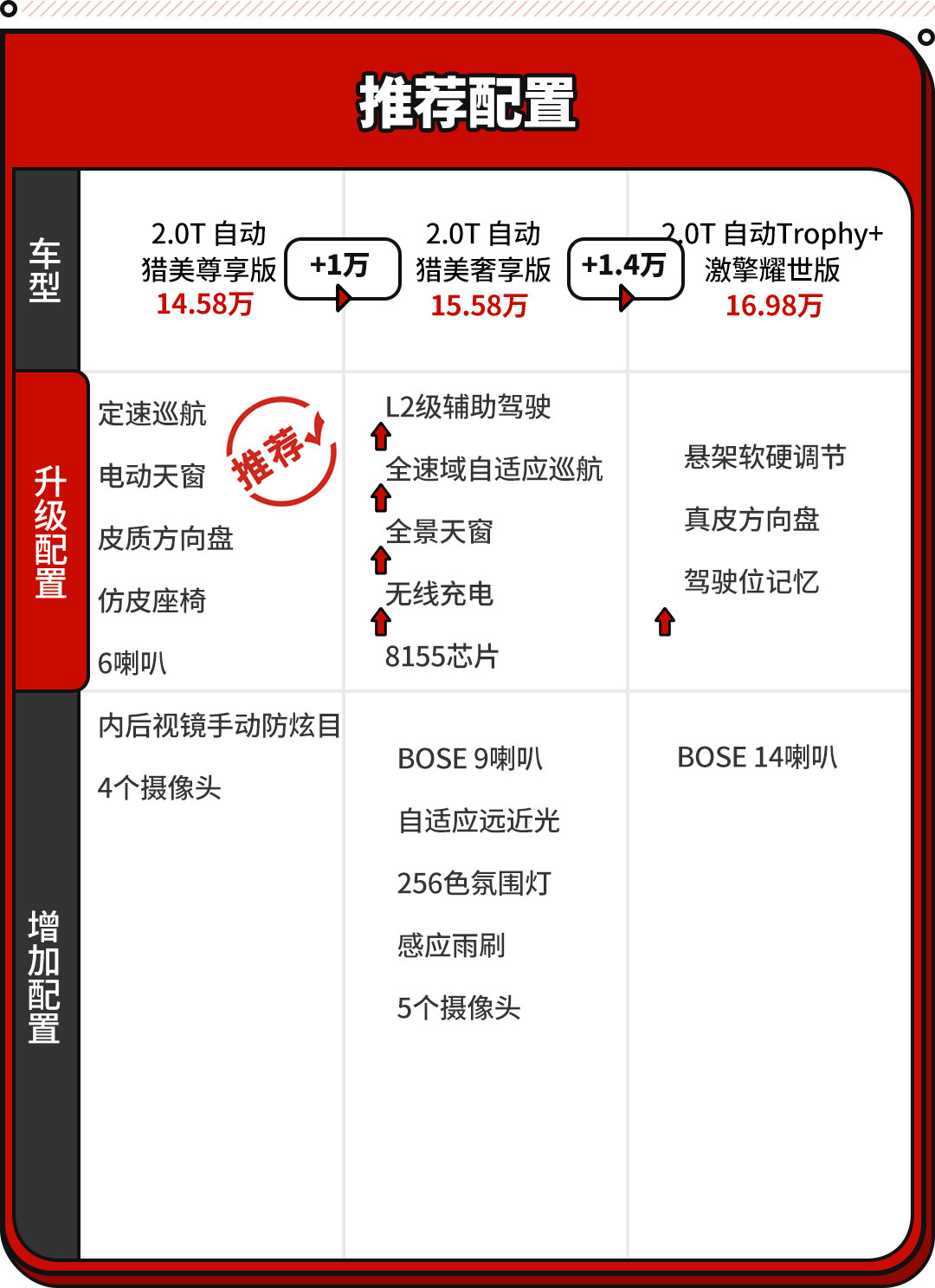 2.0T车型的配置与1.5T相似,只是动力系统不同,其中15.58万元的猎美奢享版性价比最高,贵1万元就多了L2级辅助驾驶、全景天窗、8155芯片、BOSE 9喇叭。而顶配最贵的配置是悬架软硬调节。