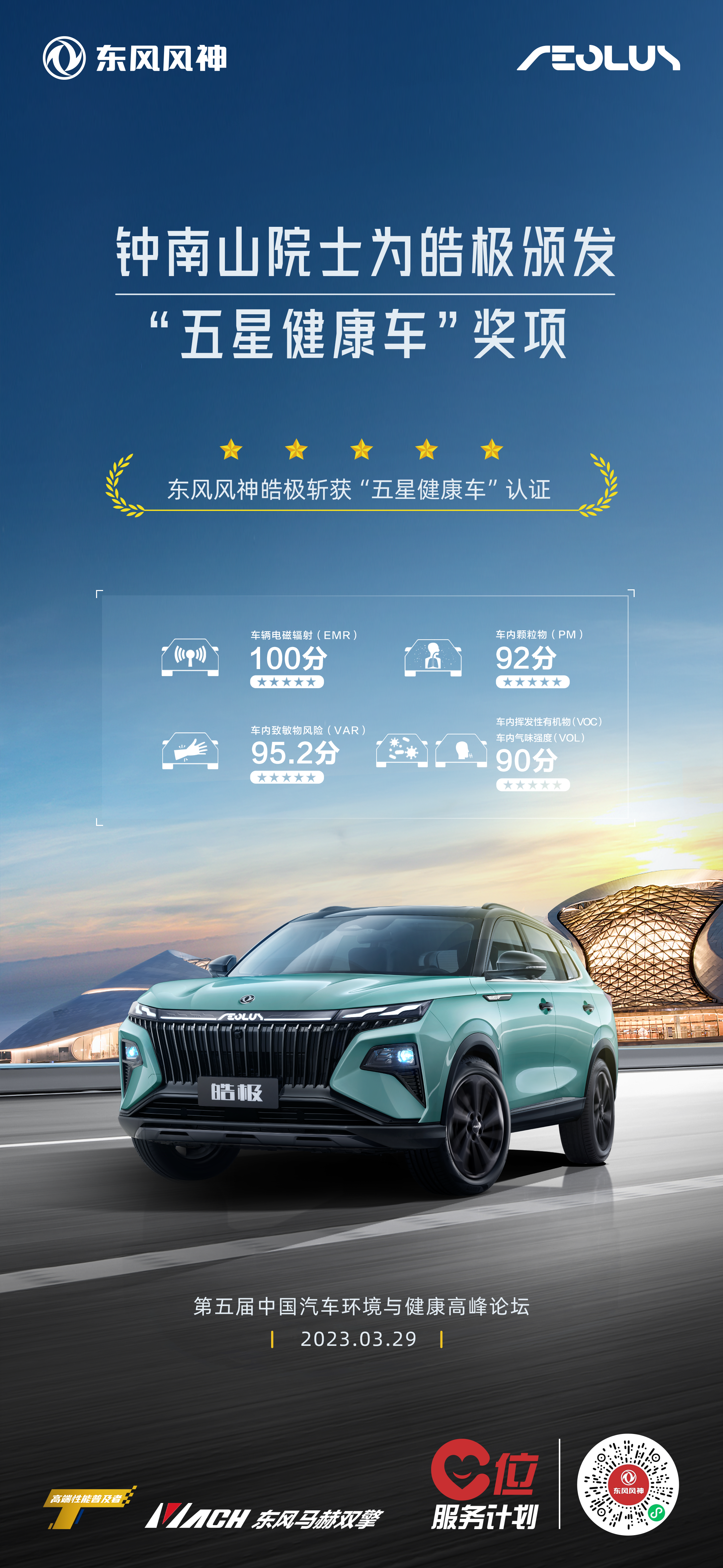 3月29日,以“关注车内环境,倡导健康出行”为主题的第五届中国汽车环境与健康高峰论坛在广州举行。高端混动SUV新标杆东风风神皓极获评中国汽研2022年度“五星健康车”,在数百位行业专家、权威媒体、嘉宾的共同见证下,正是由钟南山院士授奖。
