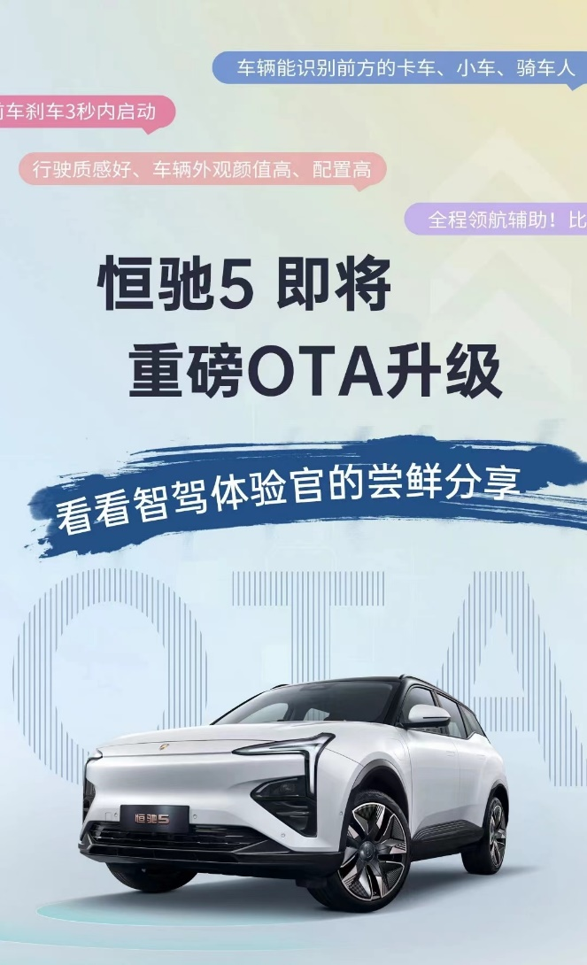 近日,恒驰5迎来重磅OTA升级,据了解,本次升级基于对用户用车体验和数据反馈,共涉及12个控制器(ECU)优化、14项新增功能、25项功能优化。