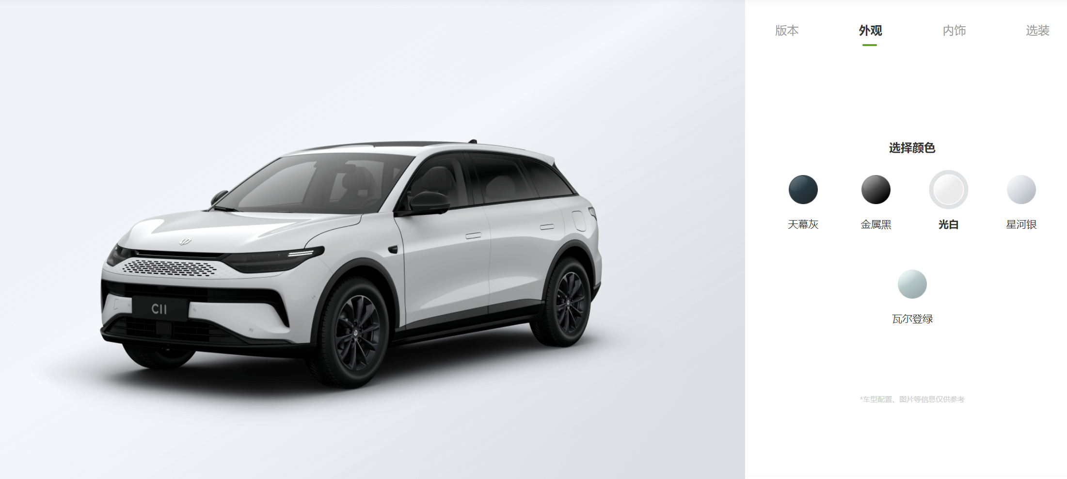 零跑C11增程版全系车型均提供了天幕灰、金属黑、光白、银河银以及瓦尔登绿五种外观配色。这5种外观配色均不需要额外加钱选装。教授个人认为光白配色与零跑C11增程版整体的设计风格更相配,事实上光白色也是这款车型的主打色。