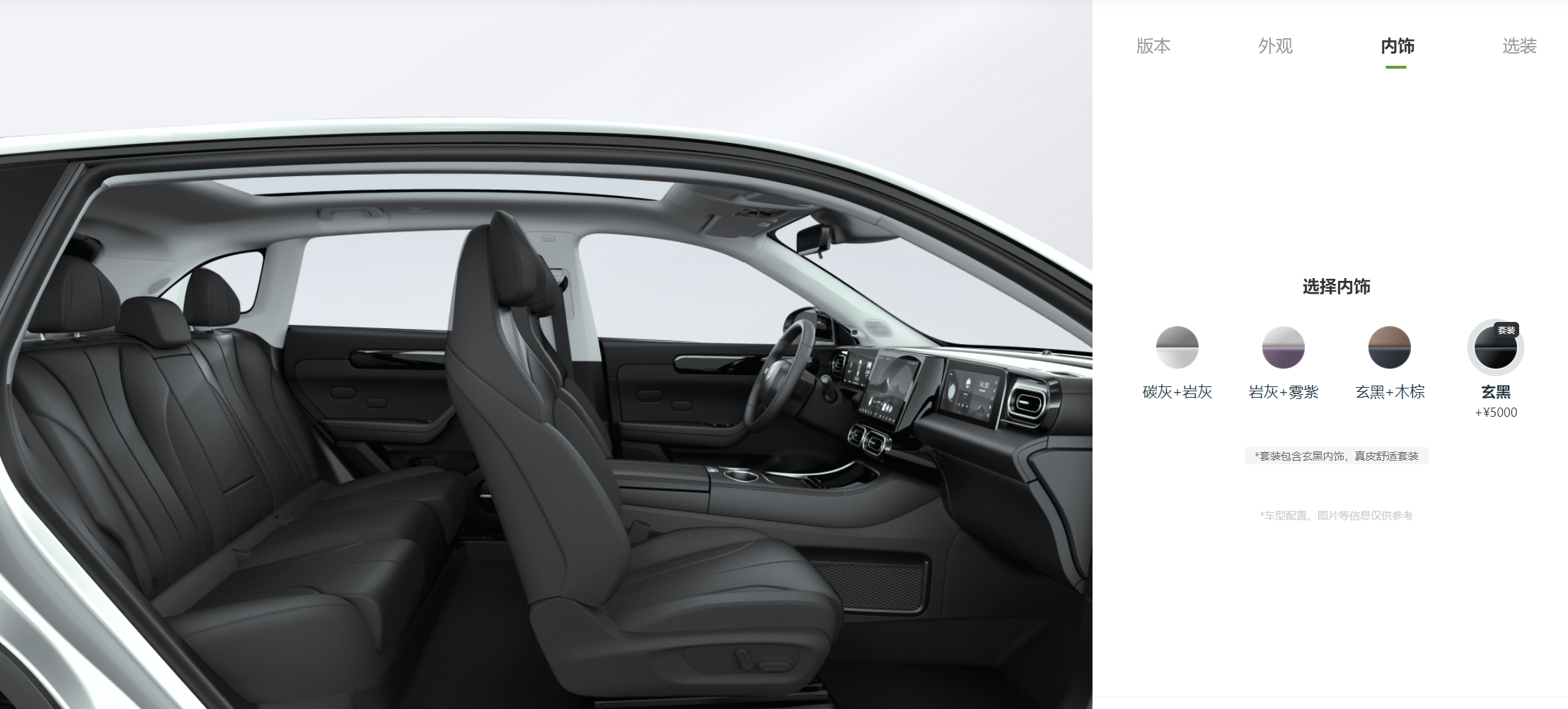 新车内饰则提供了碳灰+岩灰、岩灰+雾紫、玄黑+木棕以及玄黑套装4种配色组合。