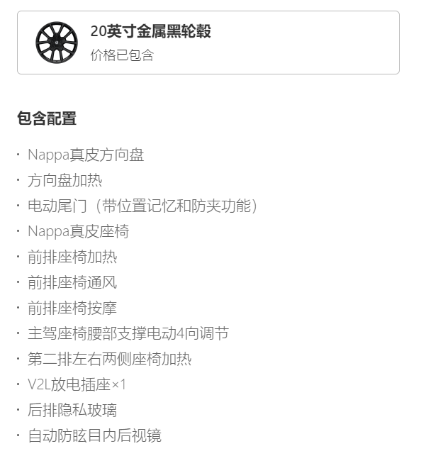 零跑C11增程版全配套装除了将原车235/60 R18规格的轮胎、轮毂升级成了255/45 R20之外,还在真皮舒适套装的基础上升级了方向盘加热、电动尾门、Nappa真皮座椅、前排座椅按摩、V2L放电插座、后排隐私玻璃、自动防眩目内后视镜等功能配置。