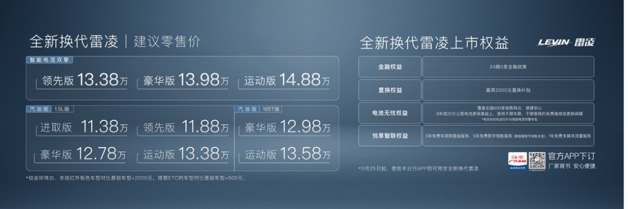 全新雷凌将全系配置车型优化到9个车款,售价区间11.38万-14.88万元。智能电混双擎版更是将价格下降3000元,起步即是智能电混双擎1.8L领先版,全面加持增量不增价的高诚意。同时,免息金融方案、置换补贴、悦享智联礼包等多重购车礼遇全部给到,特别是电池保障方面,广汽丰田提供不限年限、不限里程的免费维修或更换保障,让新生代群体轻松成为电混一族,丢掉后顾之忧。