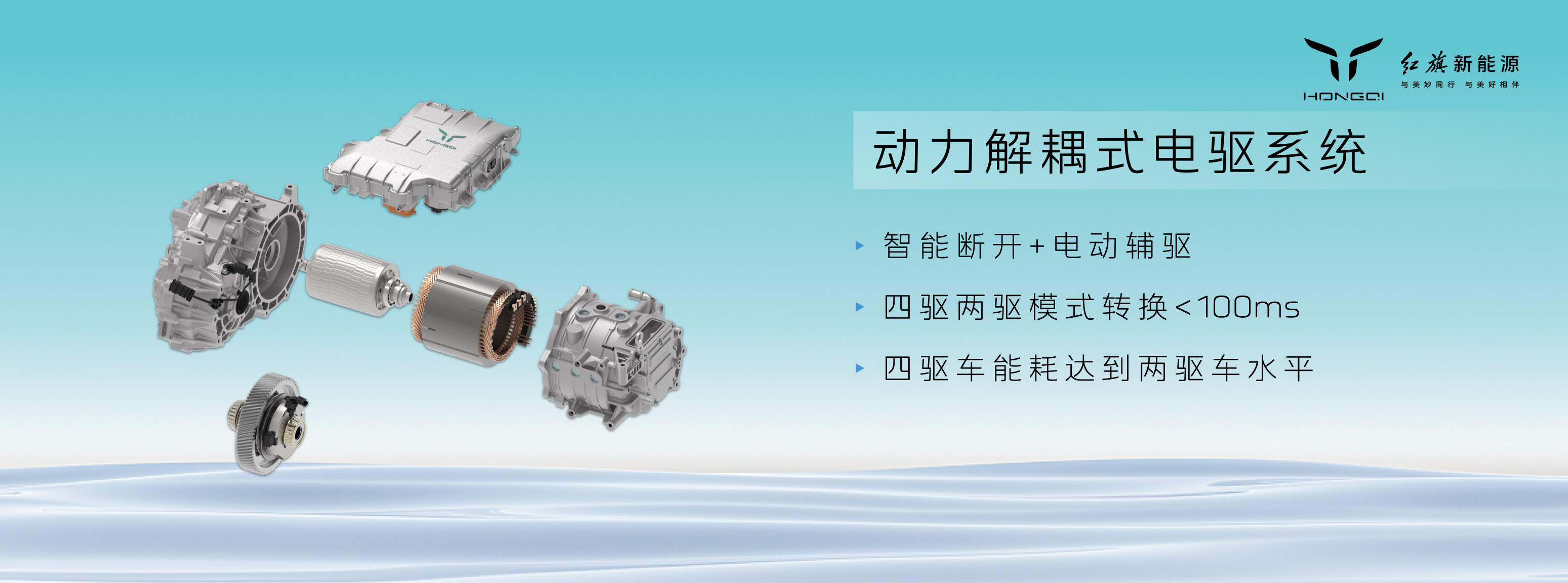在具体性能参数方面,红旗动力解耦式电驱系统输出功率可以达到200kW以上,电动机最高速可达每分钟18000rpm。并且它还采用了最新一代高性能定制磁钢和多层方导体等技术,重量更轻,材料用量也减少了17%,重量控制到了74kg以内;而对全域深度变频和超级过调制技术的突破,则让车辆高速行驶时能有更加出色的动力响应和加速性能。