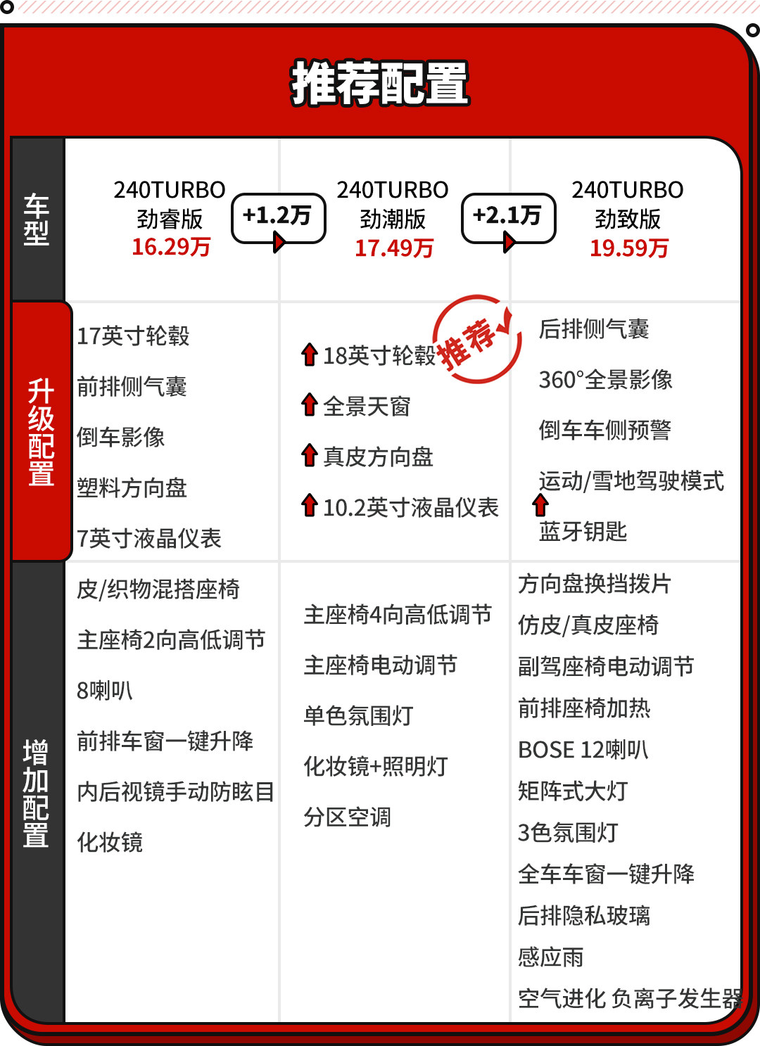 燃油版入门车型的配置相对单一,与中高配车型的差距较大,所以从次低配开始选择比较好,性价比最高的是17.49万的劲潮版。