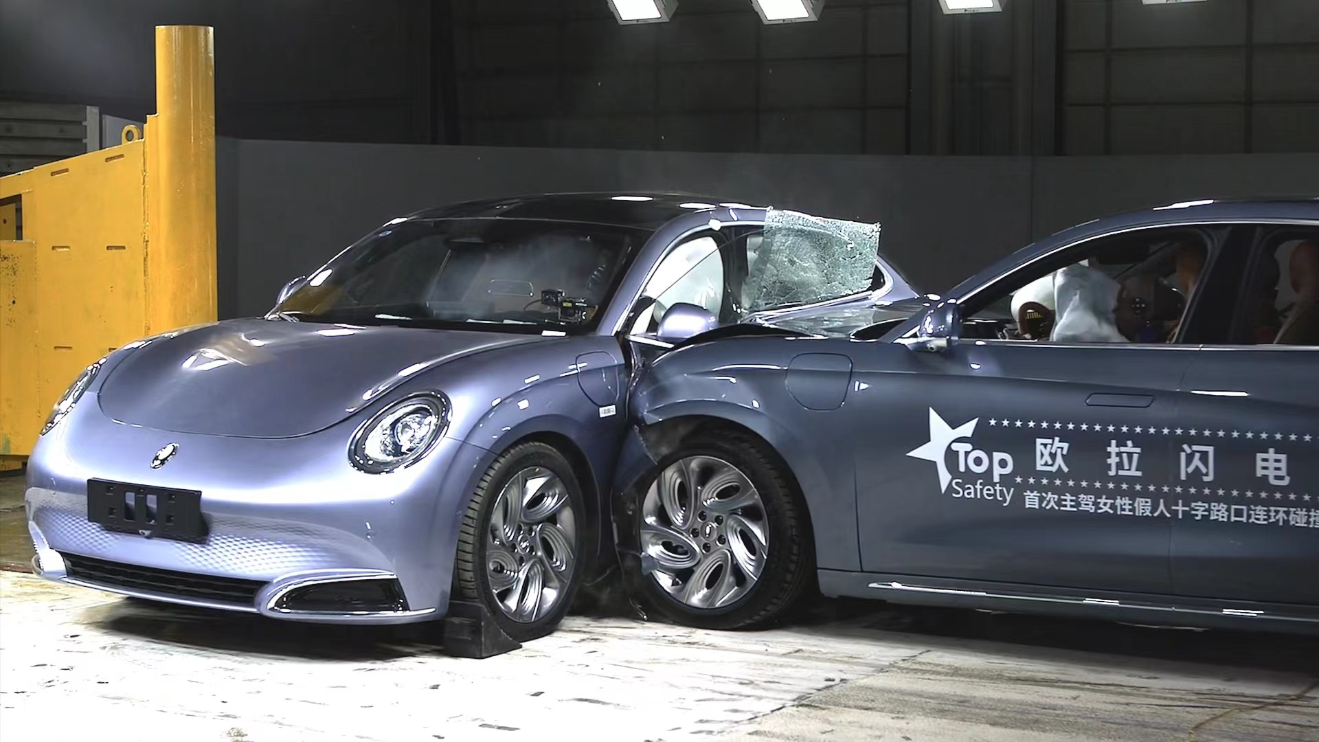 随后,欧拉闪电猫转战第二阶段测试,挑战难度再次升级,车辆将挑战难度更高、风险更大的连环碰撞。测试车辆A为碰撞车,也叫子弹车,主驾安装女性假人,副驾安装男性假人。测试车辆B为被碰撞车,主驾安装女性假人,副驾后方安装1个儿童假人。相当于测试车辆B被撞击了3次,十字路口第一次碰撞,滑向电线杆造成二次碰撞,同时子弹车没有停下,继续向前挤压,跟进又撞击了第三次。