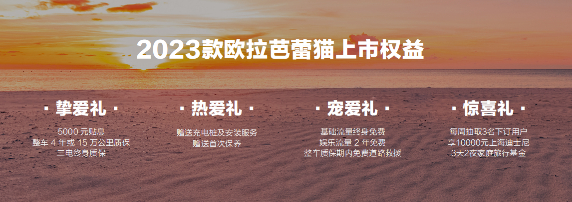伴随2023款欧拉芭蕾猫上市,用户权益进一步升级:“挚爱礼”提供整车4年或15万公里质保及三电终身质保,5000元贴息,并有0首付、0利息、0月供等多种金融产品可选;“热爱礼”提供免费充电桩及安装服务,并赠送新车首次保养;“宠爱礼”提供基础流量终身免费、娱乐流量2年免费,整车质保期内免费道路救援;“惊喜礼”每周抽取3名下订用户,加享价值10000元的上海迪士尼3天2夜家庭旅行基金,让“宠粉”爱及家人。欧拉官方APP、线上小程序现已全面接受预定,也可前往欧拉经销商门店试驾体验。