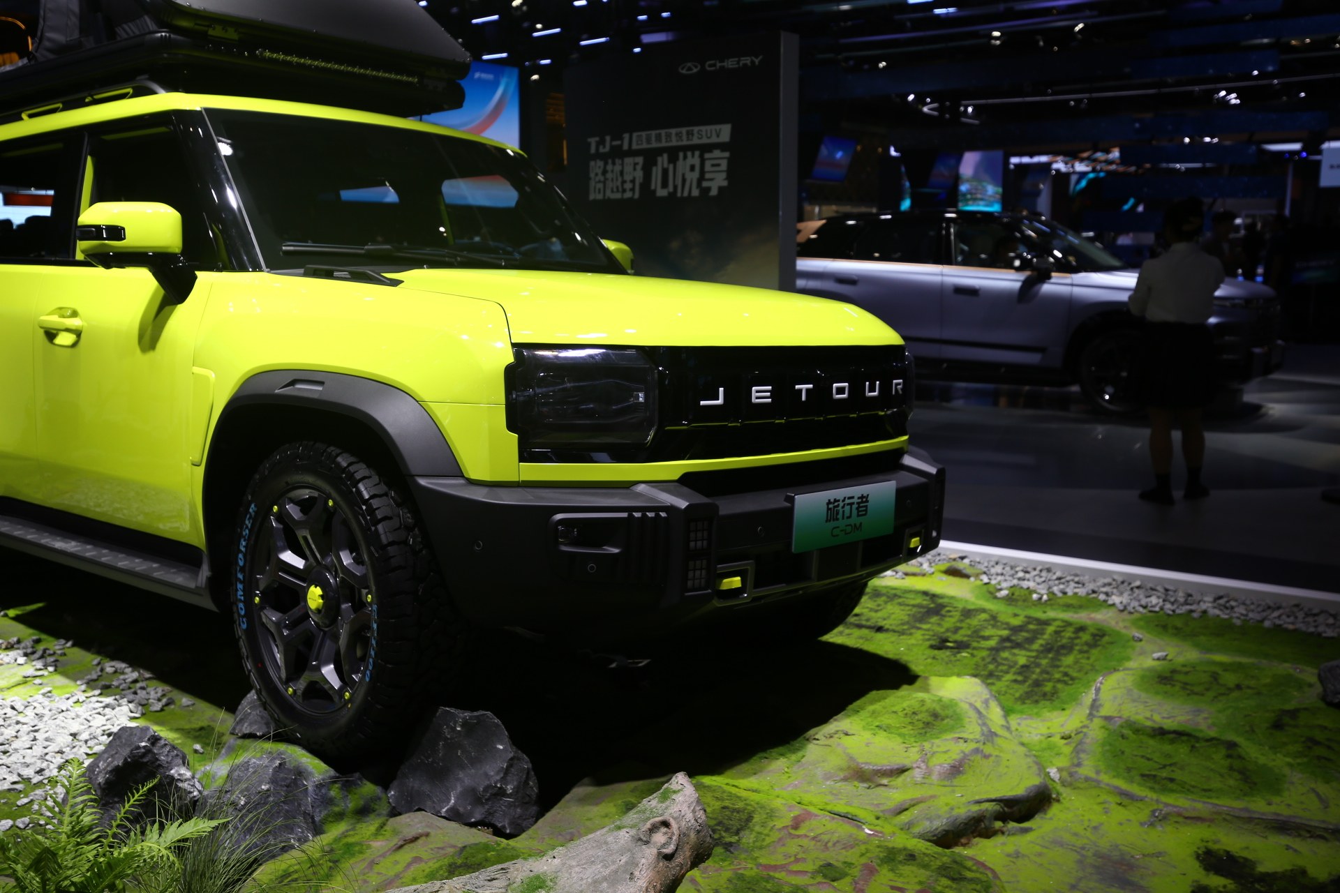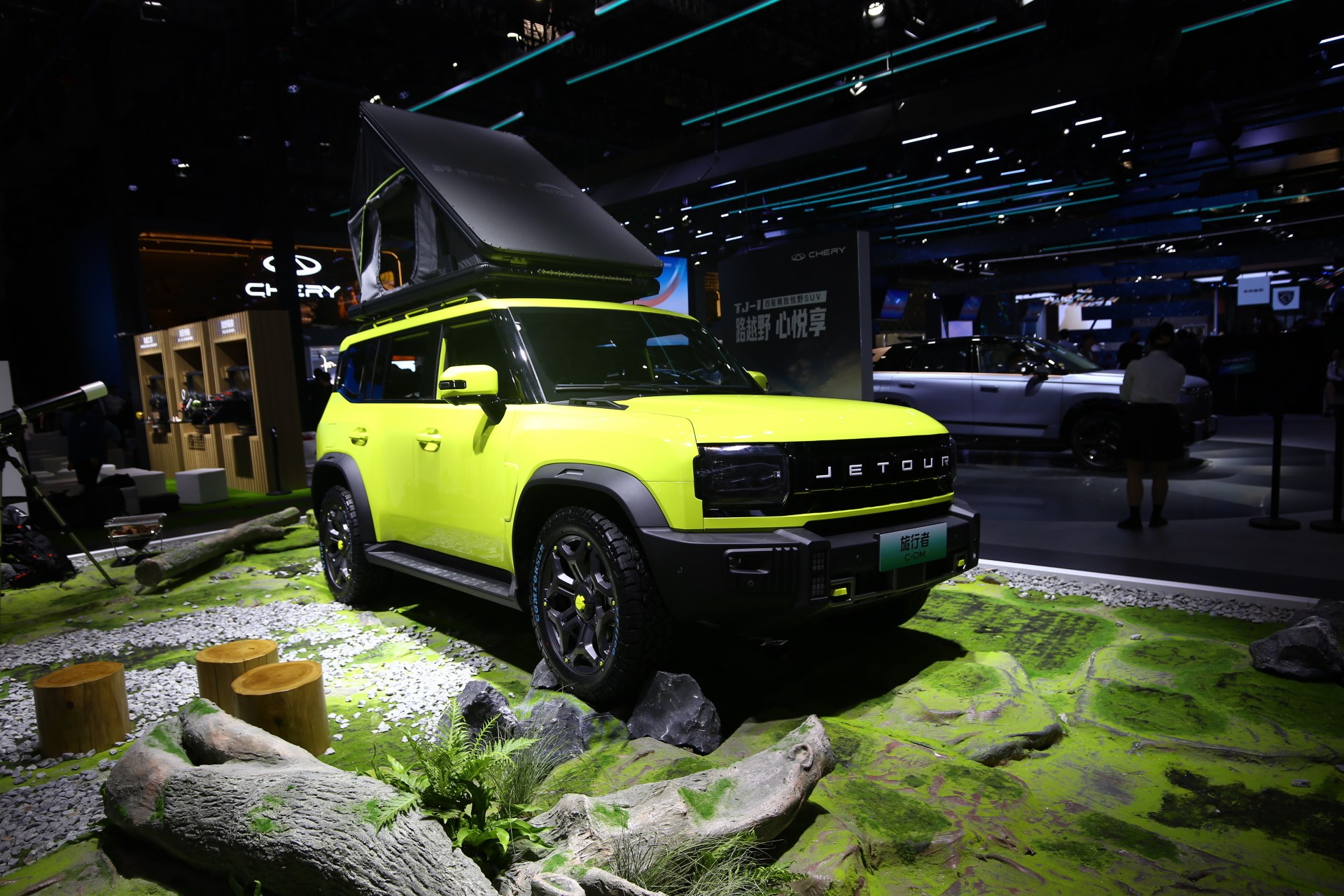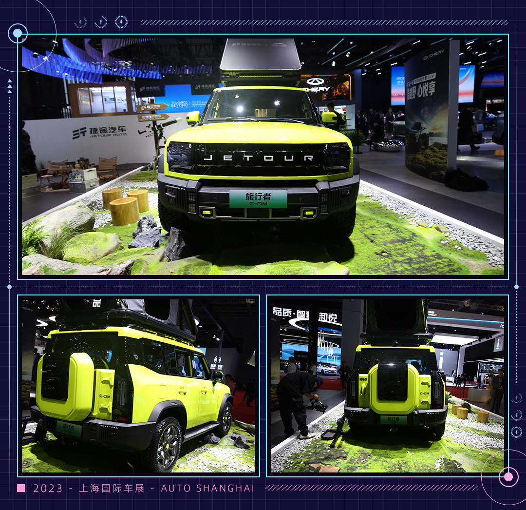 从现场图不难看出,旅行者还用了硬派SUV非常常见的外挂式备胎设计,而观察整车也同时会发现,旅行者在整个车辆的下半部分,几乎全都采用了灰色的颜色喷涂,这当然也是彰显其硬核本色的一种外化象征。不过在现场我们同时也能看到,这台绿色的展车顶部装了一个大大的车顶帐篷,结合旅行者这个车名,其实捷途想通过这款车传递给消费者的信息已经很明确了,就是我们前面提到的那样:真正的旅行,其实不只有一种形式。
