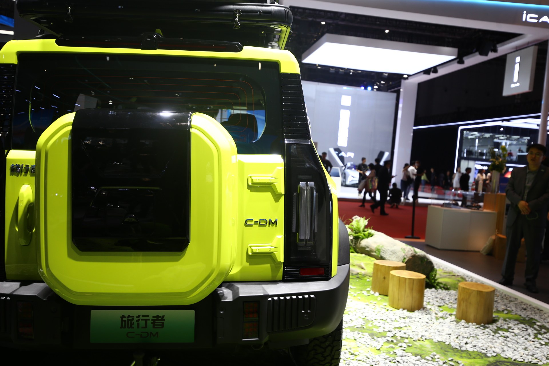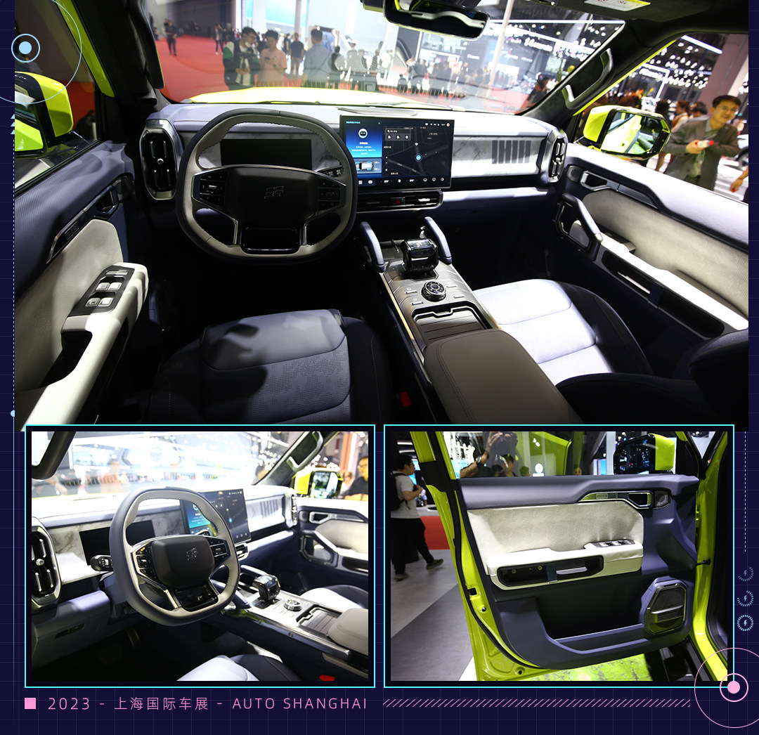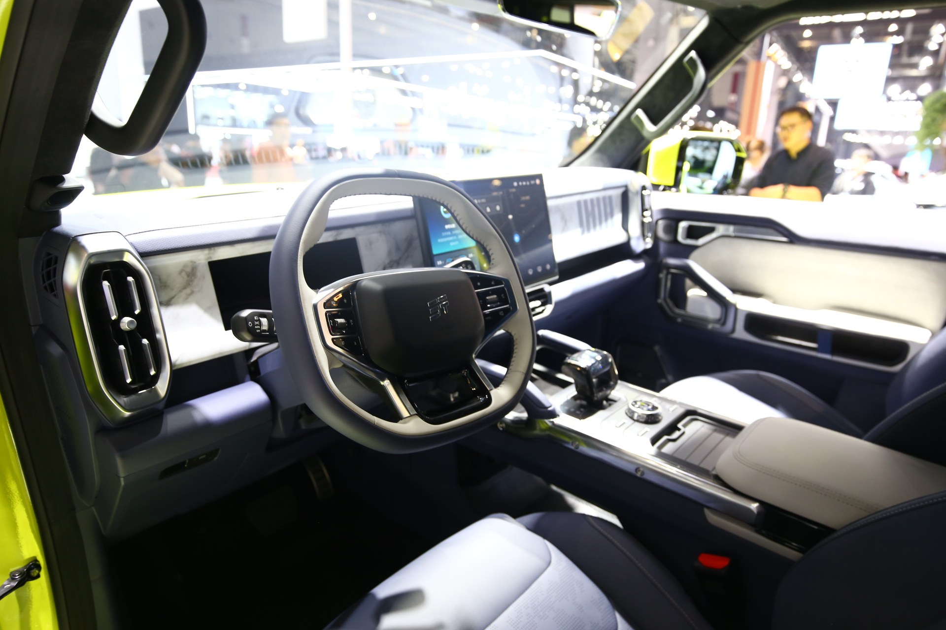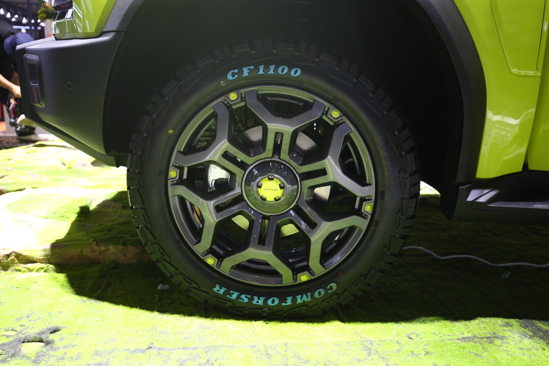 旅行者的外观是很典型的硬派越野车设计,方正的车身造型,通过角离去角都很大的车头车尾设计,再加上非常硬核的车体线条,在外观上突出一个“硬”字。尽管在车展现场我们所看到的展车搭载了普通的轮胎,但从旅行者那宽大的前后轮拱看来,这款车应该是可以安装越野用的AT胎的。