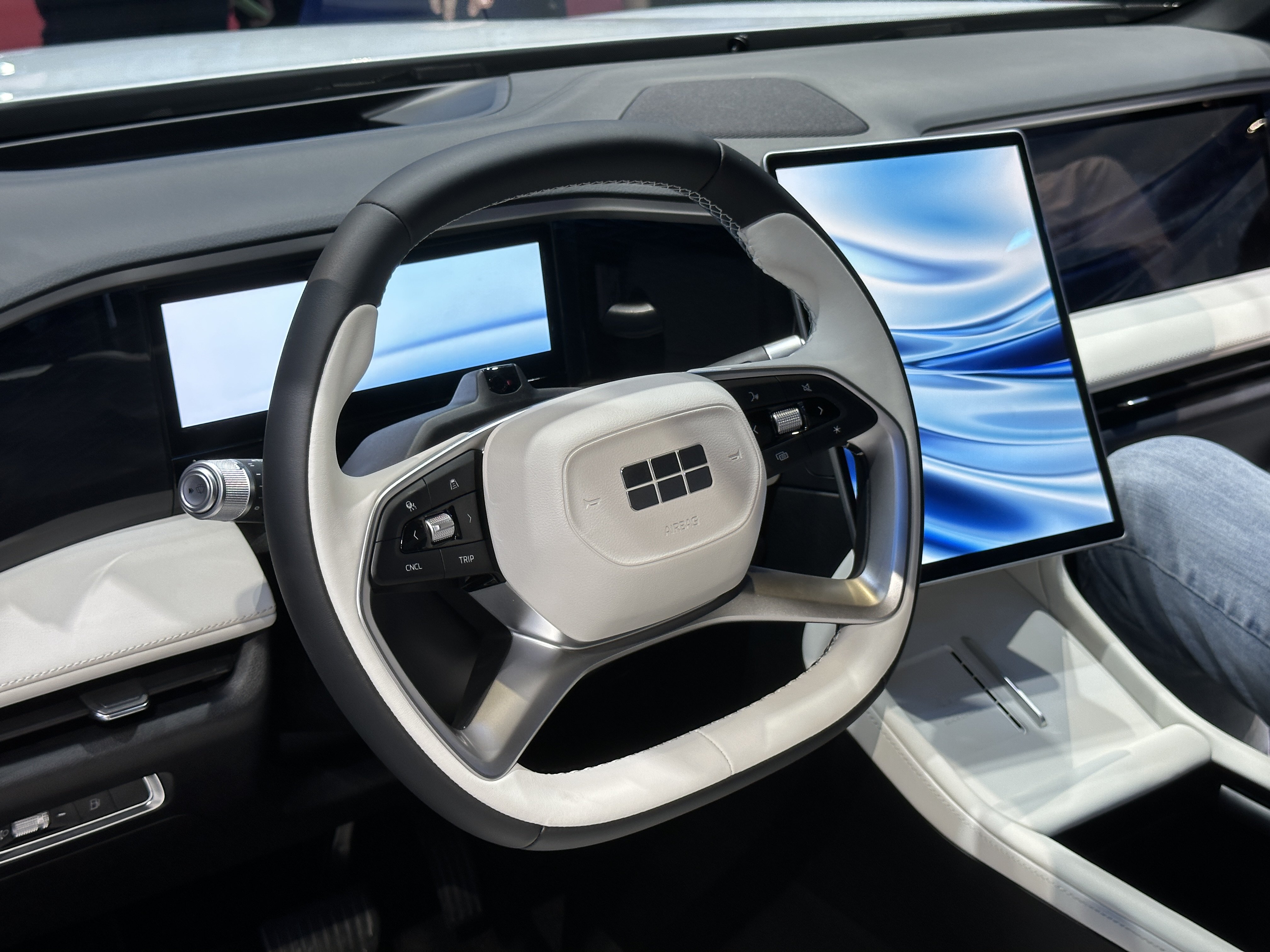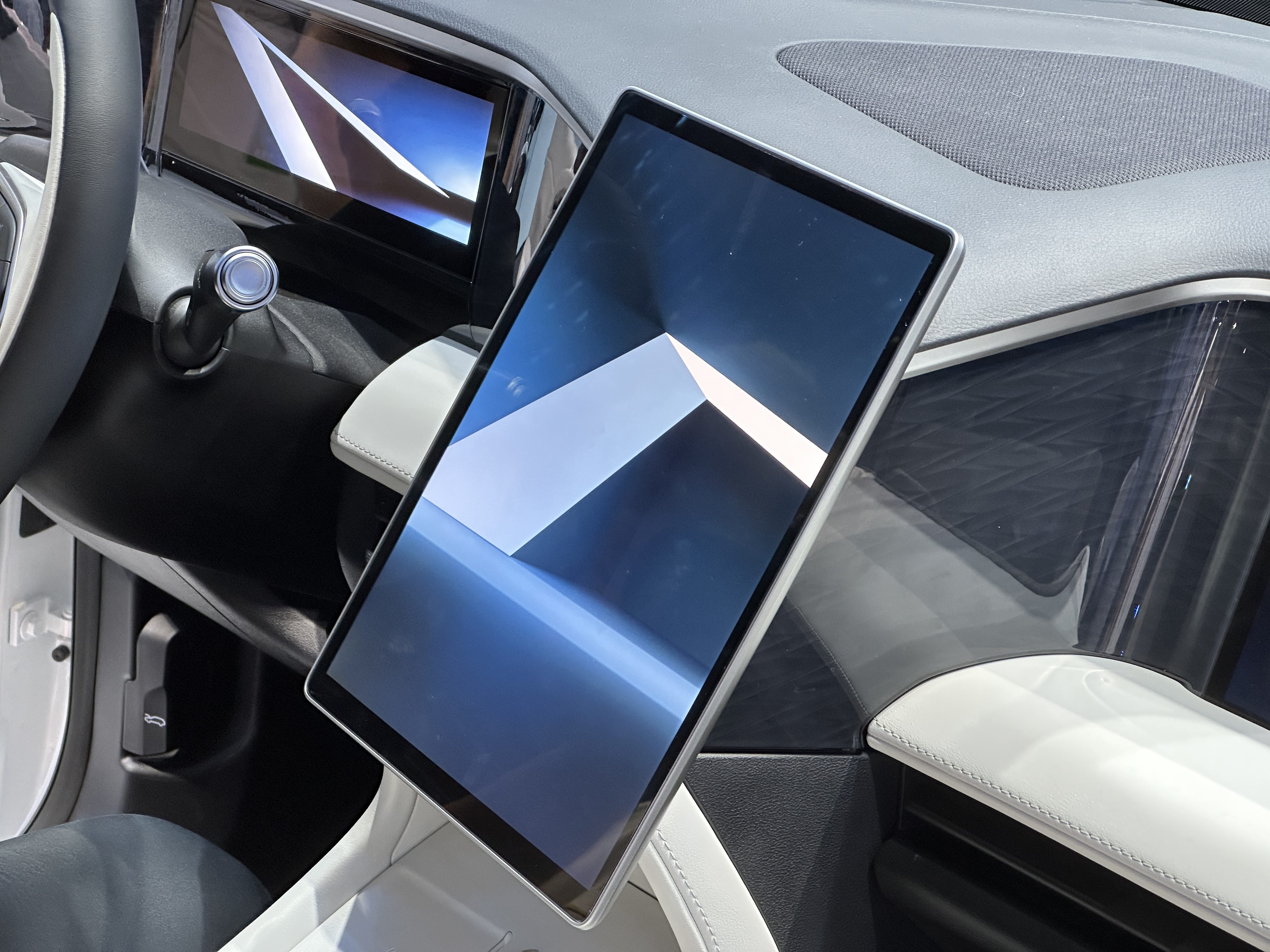 和外观一样,银河L7的内饰并不是那种极其个性化的设计,主要突出的是简约和科技感,一上车,映入眼帘的就是三块大屏幕。并且,为了更好服务乘客,中控屏朝主驾有轻微倾斜,副驾娱乐屏位置被尽量前移,保证了副驾驶双眼和屏幕之间有足够的距离。