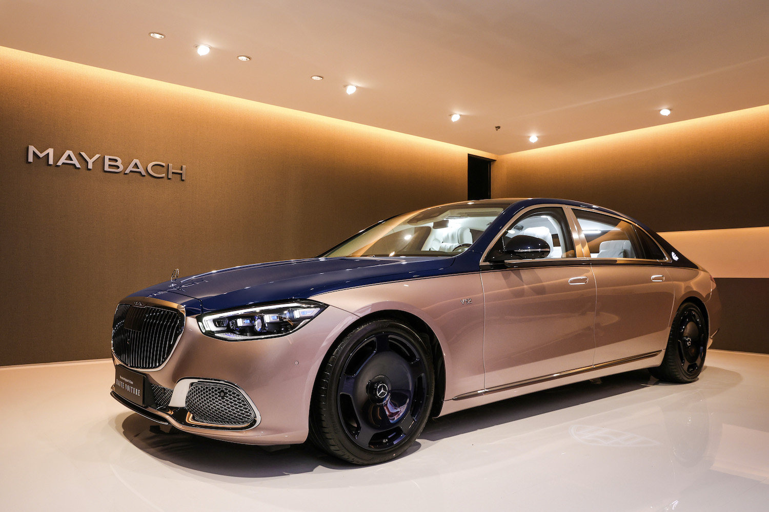 以高级定制时装为灵感度身打造的梅赛德斯-迈巴赫S级Haute Voiture限量高定融合精湛工艺、高品质材质与至臻细节,展示出前所未有的专属尊享,全球限量发售150台。外观采用独特的双色漆面:车身上部及轮毂喷涂带金属光泽的海岳蓝色,车身下部采用浅玫瑰金色,碰撞出别具一格的迷人光彩。座舱内,水晶白色皮革与精致的高品质Bouclé软呢织物巧妙相融,处处彰显高定时尚感。中控台饰有专属徽章,以其在限量150台中独一无二的编号展现每一辆典藏臻品世代相传的价值。后车门面板镶嵌的Haute Voiture专属徽章,同样呈现出这款高定杰作的尊崇身份。