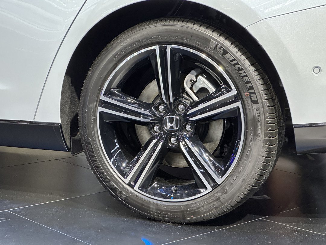 侧面是十一代雅阁最性感、最美的地方,修长的车身加上溜背式造型令人欲罢不能,轮毂也换装了全新五幅式设计,并配备了米其林e·聆悦轮胎,规格为235/45 R18。该轮胎主要面向高端舒适性电动汽车市场,具有耐用、静音、精准操控等属性。因此,十一代雅阁在胎噪上控制得更好,带来更好的NHV表现。